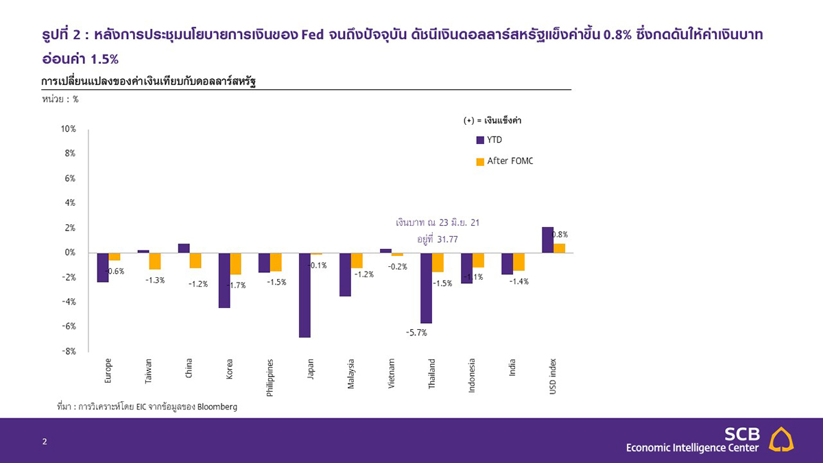 หลังการประชุม FOMC เงินบาทเผชิญแรงกดดันด้านอ่อนค่าจากการที่ค่าเงินดอลลาร์สหรัฐปรับแข็งค่าขึ้น ซึ่ง EIC มองว่า เงินบาทอาจยังเผชิญกับแรงกดดันด้านอ่อนค่าในไตรมาสที่ 3 ได้ อย่างไรก็ดี การแข็งค่าของเงินดอลลาร์สหรัฐ มีแนวโน้มชะลอลงในช่วงปลายปีนี้ EIC จึงคงประมาณการเงินบาท ณ สิ้นปี 2021 ที่กรอบ 31-32 บาทต่อดอลลาร์สหรัฐ โดยนับตั้งแต่การประชุมนโยบายการเงินของ Fed จนถึงปัจจุบัน ดัชนีเงินดอลลาร์สหรัฐแข็งค่าขึ้น 0.78% มาอยู่ที่ 91.84 ซึ่งกดดันให้ค่าเงินบาทอ่อนค่า 1.52% มาอยู่ที่ 31.77 ในช่วงเวลาเดียวกัน EIC ประเมินว่าเงินบาทจะเผชิญแรงกดดันจากการแข็งค่าของเงินดอลลาร์สหรัฐมากขึ้นในไตรมาสที่ 3 ซึ่งเป็นผลจากการที่ Fed อาจเริ่มสื่อสารถึงการทำ QE tapering อย่างไรก็ดี EIC คาดว่าการแข็งค่าของเงินดอลลาร์สหรัฐจะเริ่มชะลอลงในช่วงปลายปี จากการฟื้นตัวของประเทศเศรษฐกิจหลักอื่น ๆ โดยเฉพาะยุโรป ที่จะทยอยเร่งตัวขึ้นในไตรมาสต่อจากนี้ ขณะที่การฟื้นตัวของสหรัฐฯ จะเริ่มชะลอลง ผนวกกับ ECB มีแนวโน้มลดการเข้าซื้อสินทรัพย์ทางการเงินภายในไตรมาส 3 ขณะที่ Fed อาจเริ่มกระบวนดังกล่าวในช่วงต้นปี 2022 ปัจจัยดังกล่าวจะทำให้เงินดอลลาร์สหรัฐไม่แข็งค่าขึ้นมากนัก และเมื่อประกอบกับแนวโน้มสถานการณ์ COVID-19 ที่คาดว่าจะปรับดีขึ้นตามความคืบหน้าของการฉีดวัคซีน และการขาดดุลบัญชีเดินสะพัดของไทยแล้ว เงินบาทน่าจะทรงตัวอยู่ในกรอบ 31-32 บาทต่อดอลลาร์สหรัฐได้ ณ สิ้นปี 2021