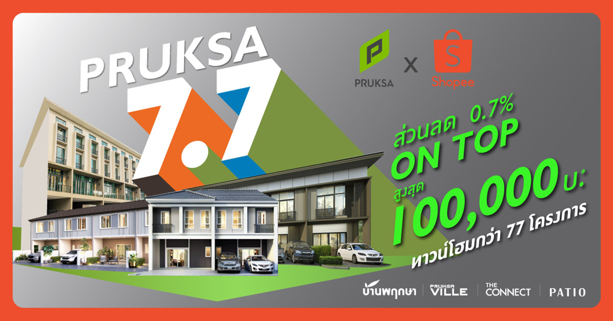 มืตหุ้น – พฤกษา’ ผู้นำอสังหาริมทรัพย์ไทย จับมือกับ ‘ช้อปปี้’ (Shopee) ผู้นำแพลตฟอร์มอีคอมเมิร์ซในภูมิภาคเอเชียตะวันออกเฉียงใต้และไต้หวัน เจาะตลาดนักช้อปออนไลน์ เปิดตัวแคมเปญสุดปัง “ฉลอง 7 เดือน 7” เพียงซื้อคูปองจาก “Pruksa Real Estate Official Shop” ที่ ‘ช้อปปี้’ ในราคา 77 บาท ก็รับสิทธิ์ทันที Extra On Top 0.7% จากราคาสุทธิ หรือส่วนลดสูงสุด 100,000 บาท* เพื่อใช้เป็นส่วนลด ณ วันโอนกรรมสิทธิ์ สำหรับการซื้อทาวน์โฮมในเครือพฤกษาที่เข้าร่วมแคมเปญกว่า 77 โครงการ