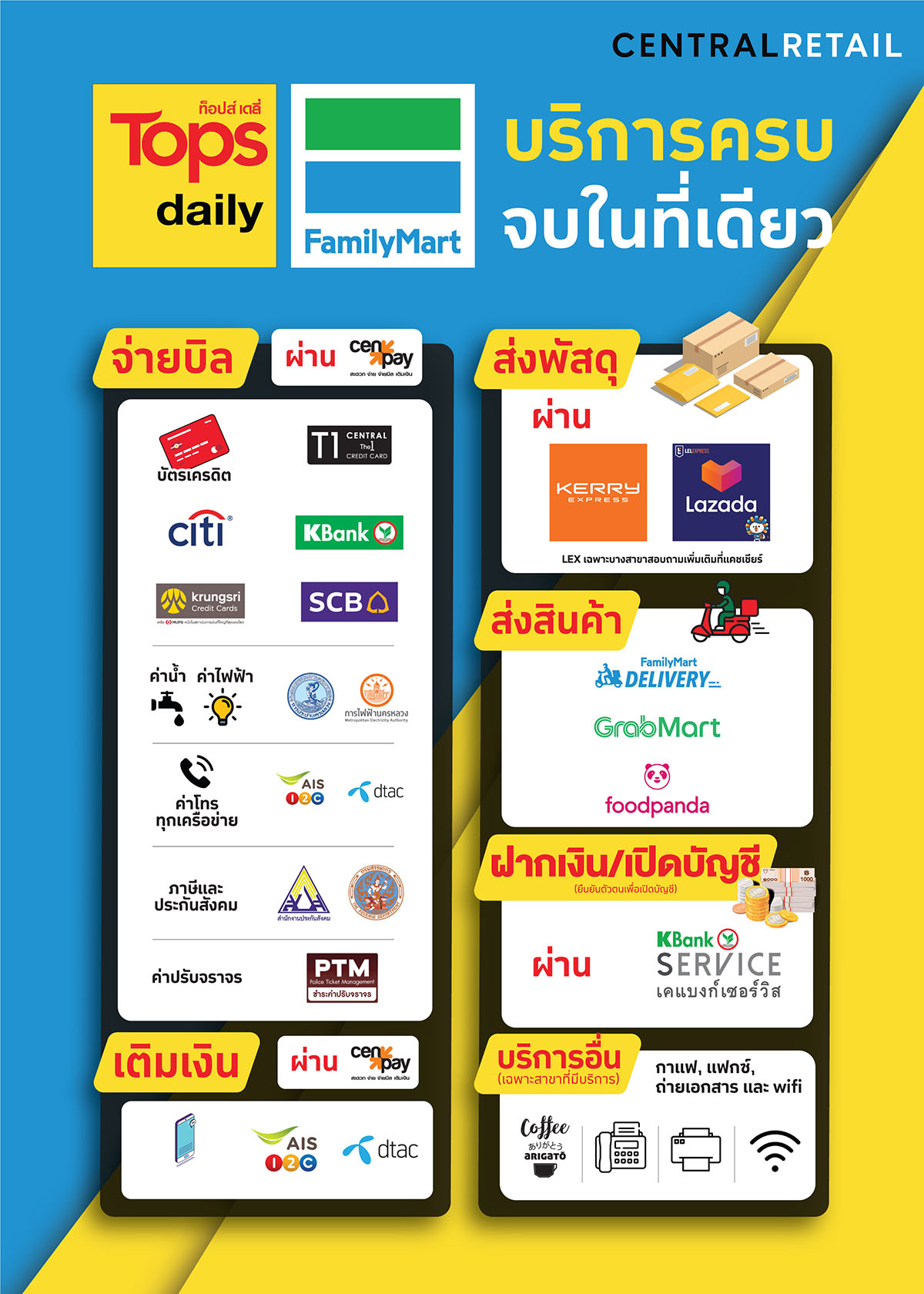 “ท็อปส์ เดลี่” และ “แฟมิลี่มาร์ท” ยังคงมุ่งมั่นพัฒนาการให้บริการให้ดียิ่งขึ้นในทุกวัน เพื่อตอบรับทุกความต้องการของลูกค้าในยุคสมัยใหม่ สร้างการจดจำเป็นร้านค้าที่ครบครันด้วยสินค้าและบริการที่ครบ จบในที่เดียว ตรวจสอบรายละเอียดการให้บริการต่างๆ ได้ที่ เฟซบุ๊ก TopsThailand, FamilyMartThailand, หรือ แอปพลิเคชั่นไลน์ @TopsThailand, @FamilyMartThailand