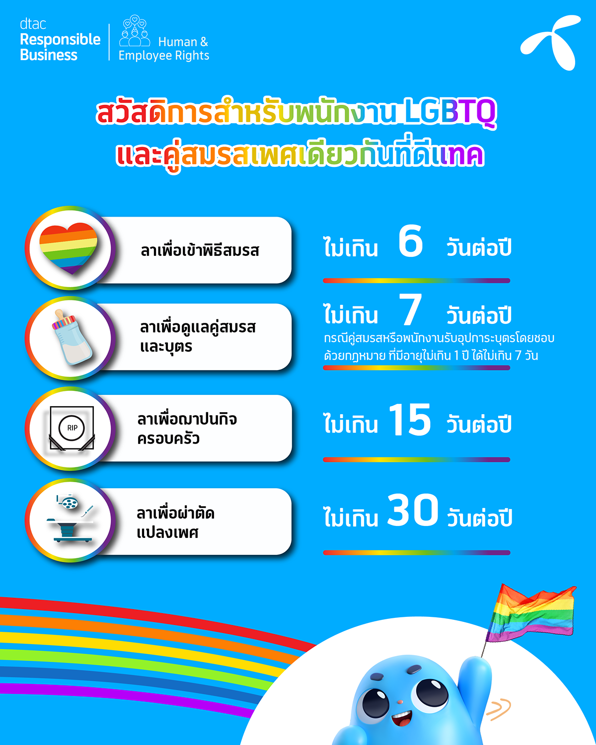 มิติหุ้น – ดีแทคได้ประกาศนโยบายสวัสดิการ เพื่อสนับสนุนการมีส่วนร่วมและความเท่าเทียม สำหรับพนักงานกลุ่ม LGBTQ (เลสเบี้ยน เกย์ ไบเซ็กชวล ทรานเจนเดอร์ เควียร์) หรือ กลุ่มคนที่มีความหลากหลายทางเพศ นโยบายดังกล่าว เน้นย้ำจุดยืนของดีแทคในการไม่ทนต่อการเลือกปฏิบัติทางเพศสภาพและรสนิยมทางเพศ อีกทั้งได้เพิ่มความครอบคลุมสวัสดิการพนักงานสำหรับคู่สมรสตามกฎหมาย ให้กับพนักงานกลุ่ม LGBTQ และคู่สมรสเพศเดียวกันด้วย นอกเหนือจากนั้น ดีแทคยังมอบสิทธิการลาเพื่ออุปการะบุตรที่ชอบด้วยกฎหมาย และการลาป่วยเพื่อการผ่าตัดแปลงเพศของพนักงาน โดยดีแทคคาดว่านโยบายสวัสดิการเท่าเทียมนี้จะช่วยขับเคลื่อนความหลากหลายและความมีส่วนร่วม (diversity & inclusion) ในองค์กรอย่างแท้จริง อันจะช่วยยกระดับผลิตภาพการทำงานและประสบการณ์ของลูกค้าในระยะยาว