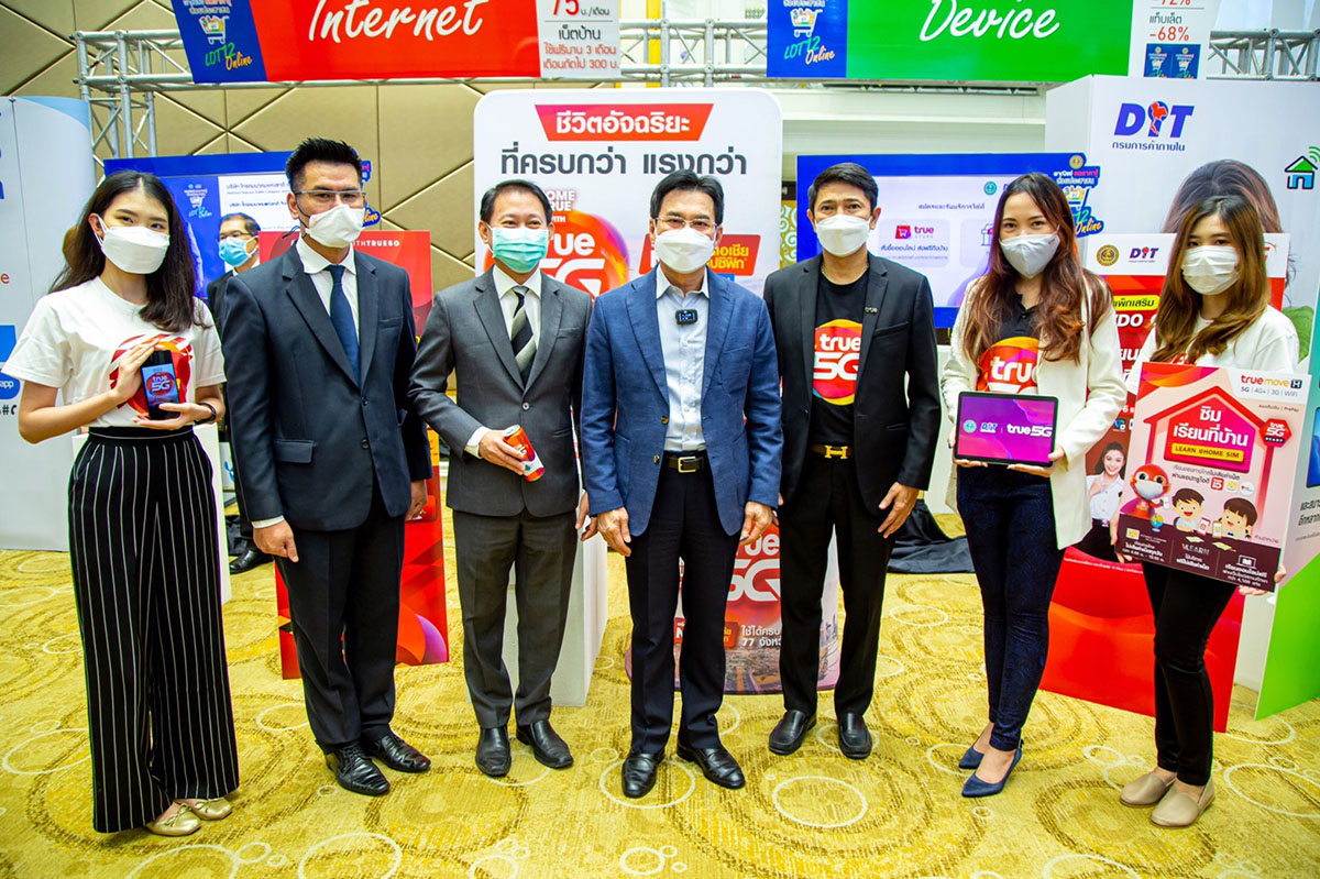มิติหุ้น – เพื่อเป็นอีกหนึ่งทางเลือกในการบรรเทาความเดือดร้อนของคนไทยที่ต้องเผชิญกับวิกฤตโควิด-19 ระลอก 3 รองนายกรัฐมนตรี และรัฐมนตรีว่าการกระทรวงพาณิชย์ นายจุรินทร์ ลักษณวิศิษฏ์ (กลาง) เป็นประธานเปิดโครงการ “พาณิชย์ลดราคา! ช่วยประชาชน” Lot12 (Online) ที่กรมการค้าภายใน ร่วมกับองค์กรภาคธุรกิจ รวมถึงกลุ่มทรู โดย นาย สหรัฐ คนองศิลป์ ผู้อำนวยการบริหาร ด้านการบริหารจัดการระดับภูมิภาค กรุงเทพฯ และปริมณฑล (ที่ 3 จากขวา) จัดขึ้นเพื่อช่วยเหลือประชาชนในการลดภาระค่าใช้จ่ายด้านการสื่อสาร เพื่อให้สามารถทำงานและเรียนออนไลน์ได้อย่างต่อเนื่อง ไม่สะดุด และมีประสิทธิภาพสูงสุด โดยกลุ่มทรู ได้เตรียมแพ็กเกจพิเศษ และอุปกรณ์สื่อสารราคาสุดคุ้ม ได้แก่