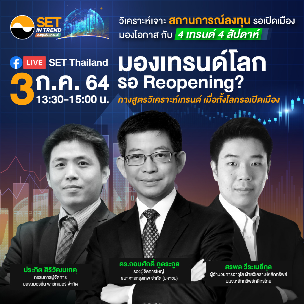มิติหุ้น – สัปดาห์แรก 3 ก.ค. พบกับหัวข้อ “มองเทรนด์โลก รอ Reopening” ชวนวิเคราะห์เทรนด์ สร้างโอกาส เมื่อโลกรอเปิดเมือง โดย ดร.กอบศักดิ์ ภูตระกูล รองผู้จัดการใหญ่ ธนาคารกรุงเทพ จำกัด (มหาชน) คุณประกิต สิริวัฒนเกตุ กรรมการผู้จัดการ บลจ.เมอร์ชั่น พาร์ทเนอร์ จำกัด (มหาชน) และ คุณสรพล วีระเมธีกุล ผู้อำนวยการอาวุโส ฝ่ายวิเคราะห์หลักทรัพย์ บมจ.หลักทรัพย์กสิกรไทย สัปดาห์ที่ 2 วันที่ 10 ก.ค. “Stock in Trend” เจาะ Theme หุ้นที่น่าสนใจหลังวิกฤติ สัปดาห์ที่ 3 วันที่ 17 ก.ค. “Mutual fund in Trend” จับทิศกองทุนรวม Theme ไหนน่าลงทุน สัปดาห์สุดท้าย 24 ก.ค. กับ “จัดพอร์ตลงทุนครึ่งปีหลัง“ จัดพอร์ตยังไงหลังคลายล็อกดาวน์ ดูรายละเอียดเพิ่มเติมที่ FB: SET Thailand