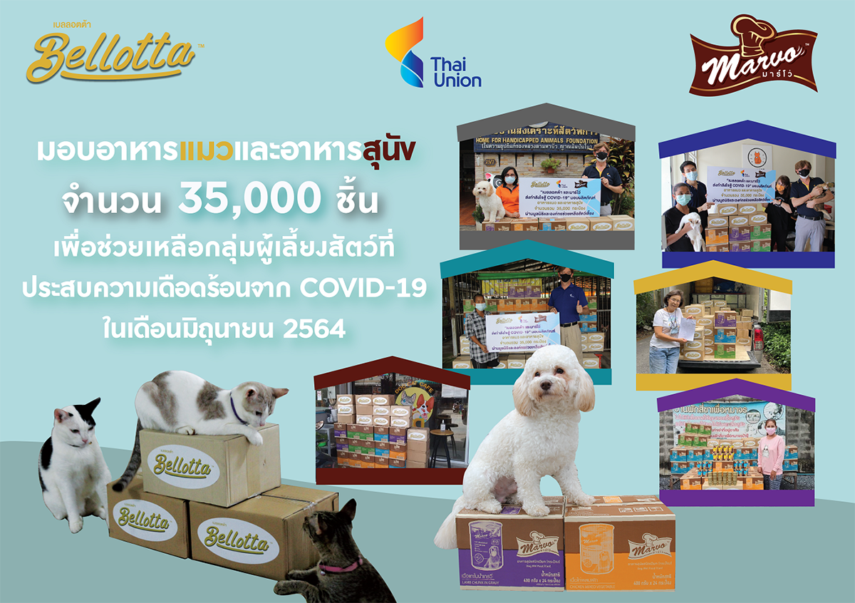 ประเทศไทยกำลังต่อสู้กับการระบาดของไวรัสโควิด 19 ระลอกที่ 3 ตั้งแต่เดือนเมษายน และไทยยูเนี่ยนได้มอบอาหารแมวเบลล็อตต้า และอาหารสุนัขมาร์โว่ไปแล้วกว่า 75,100 กระป๋องในปีนี้ เพื่อให้สถานที่พักพิงสัตว์ องค์กรสัตว์เลี้ยง และอาสาสมัครทั่วประเทศไทยสามารถเลี้ยงดูให้อาหารสัตว์เหล่านั้นได้อย่างต่อเนื่องให้ได้มากที่สุด