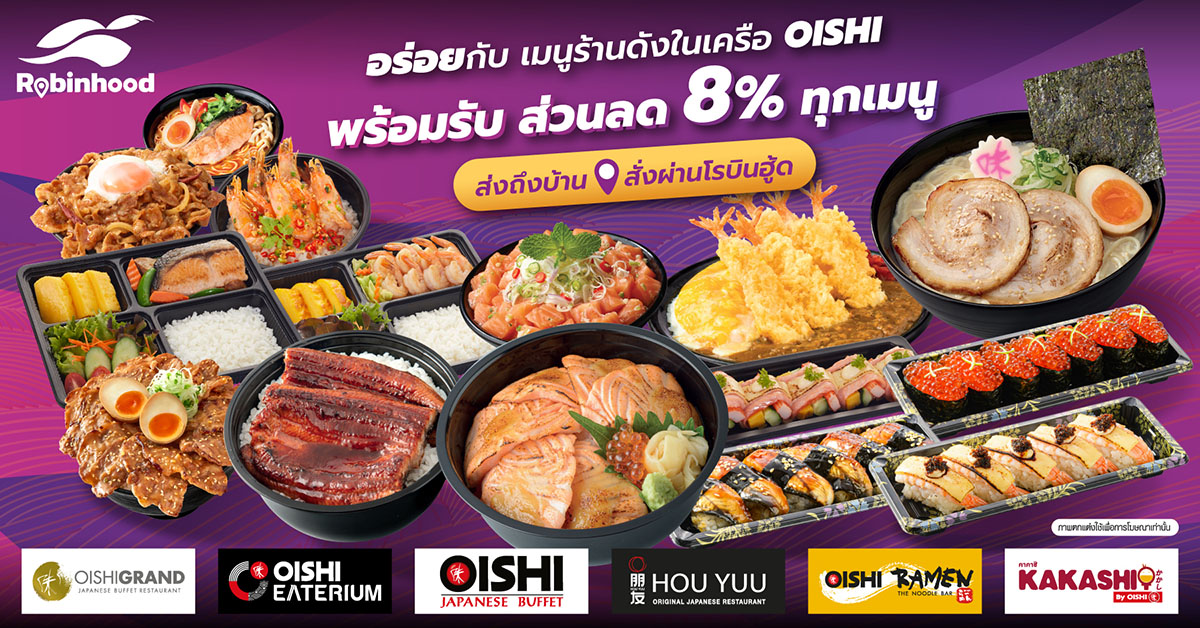 โดยล่าสุดผนึกกำลังหลากหลายแบรนด์ในเครือ เดินหน้าขยายช่องทางเข้าถึงความอร่อยร่วมกับพันธมิตรรายใหม่เพิ่มเติมอีก 1 ราย คือ แอปฯ “โรบินฮู้ด” (Robinhood) พร้อมเคาะประตูส่งตรงประสบการณ์อาหารญี่ปุ่นแบบจัดเต็มถึงบ้าน ซึ่งมีเมนูยอดนิยมให้เลือกตั้งแต่ ซูชิ ซาชิมิ ดงบุริ เทะมากิ เทปปันยากิ และอีกมากมาย รวมแล้วมากกว่า 100 รายการ จากร้านอาหารญี่ปุ่น (1) โออิชิ แกรนด์ (2) โออิชิ อีทเทอเรียม (3) โออิชิ บุฟเฟต์ (4) โออิชิ ราเมน (5) คาคาชิ รวมทั้ง (6) โฮว ยู อีกด้วย