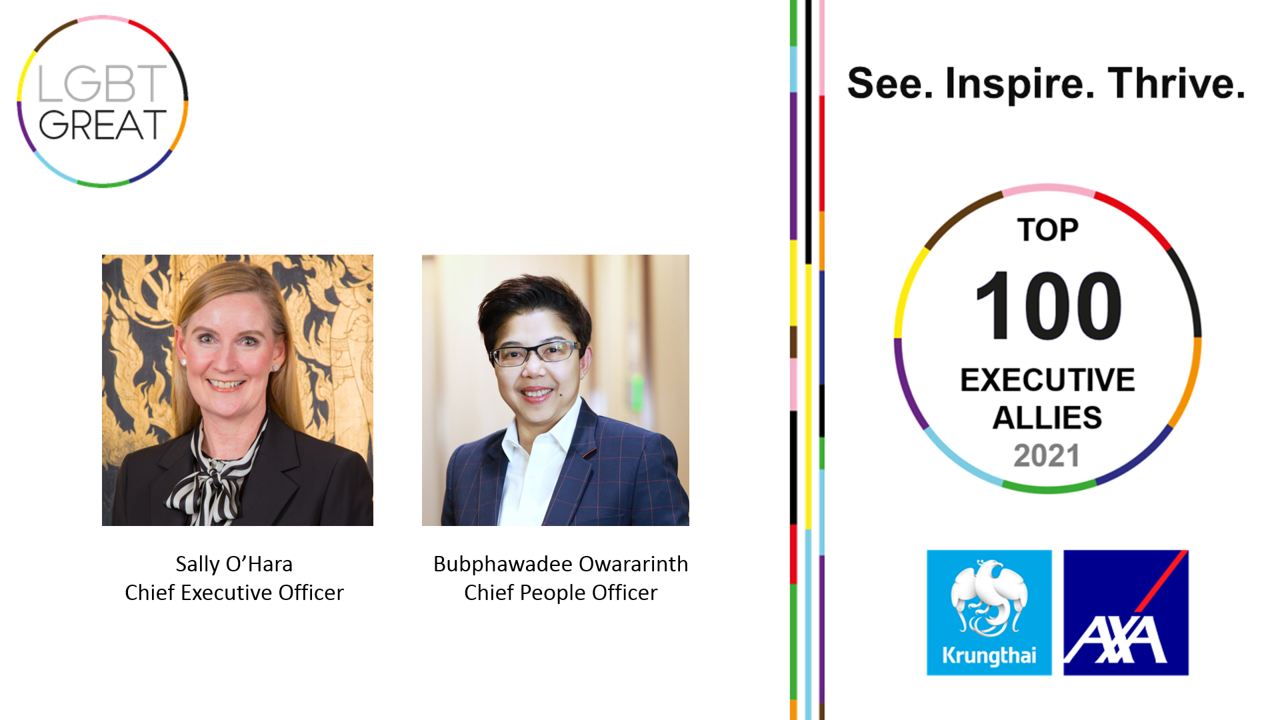 นางแซลลี่ โอฮาร่า ประธานเจ้าหน้าที่บริหาร และนางสาวบุปผาวดี โอวรารินท์ ประธานเจ้าหน้าที่บริหารฝ่ายทรัพยากรบุคคล บมจ.กรุงไทย-แอกซ่า ประกันชีวิต ได้รับคัดเลือกให้เป็น Top 100 Executive Allies 2021 โดย LGBT Great รางวัลดังกล่าวจัดขึ้นเพื่อยกย่องผู้นำที่สร้างแรงบันดาลใจ กล้าที่จะก้าวขึ้นมาแสดงจุดยืน และแสดงให้เห็นถึงการเป็นพันธมิตรที่สนับสนุนกลุ่ม LGBT+ ถือเป็นอีกหนึ่งความภาคภูมิใจ และตอกย้ำจุดยืนของบริษัทฯ ในการมุ่งมั่นส่งเสริมความเท่าเทียมกัน พร้อมทั้งเคียงข้างทุกความเชื่อมั่น ดูแลกันตลอดไป