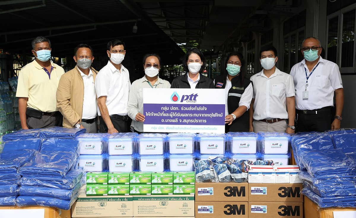 มิติหุ้น – นางกนกพร รอดรุ่งเรือง ผู้ช่วยกรรมการผู้จัดการใหญ่บริหารชื่อเสียงองค์กรและกิจการเพื่อสังคม บริษัท ปตท. จำกัด (มหาชน) (กลางขวา) เป็นผู้แทน ปตท. มอบ สิ่งของช่วยเหลือผู้ได้รับผลกระทบจากเหตุเพลิงไหม้โรงงาน หมิงตี้ อ.บางพลี จ.สมุทรปราการ ได้แก่ กล่องพลังใจ ซึ่งเป็นของใช้จำเป็นในชีวิตประจำวัน หน้ากากอนามัย ผ้าห่ม และหน้ากากกันสารพิษ โดยมีนางลาวัลย์ ปุณะศิริ รองปลัดองค์การบริหารส่วนตำบลบางพลีใหญ่ (กลางซ้าย) เป็นผู้แทนรับมอบ เพื่อส่งต่อสิ่งของให้แก่จุดพักพิงผู้ประสบภัยในพื้นที่จำนวน 9 จุด ช่วยบรรเทาความเดือดร้อนของประชาชน ณ องค์การบริหารส่วนตำบลบางพลีใหญ่
