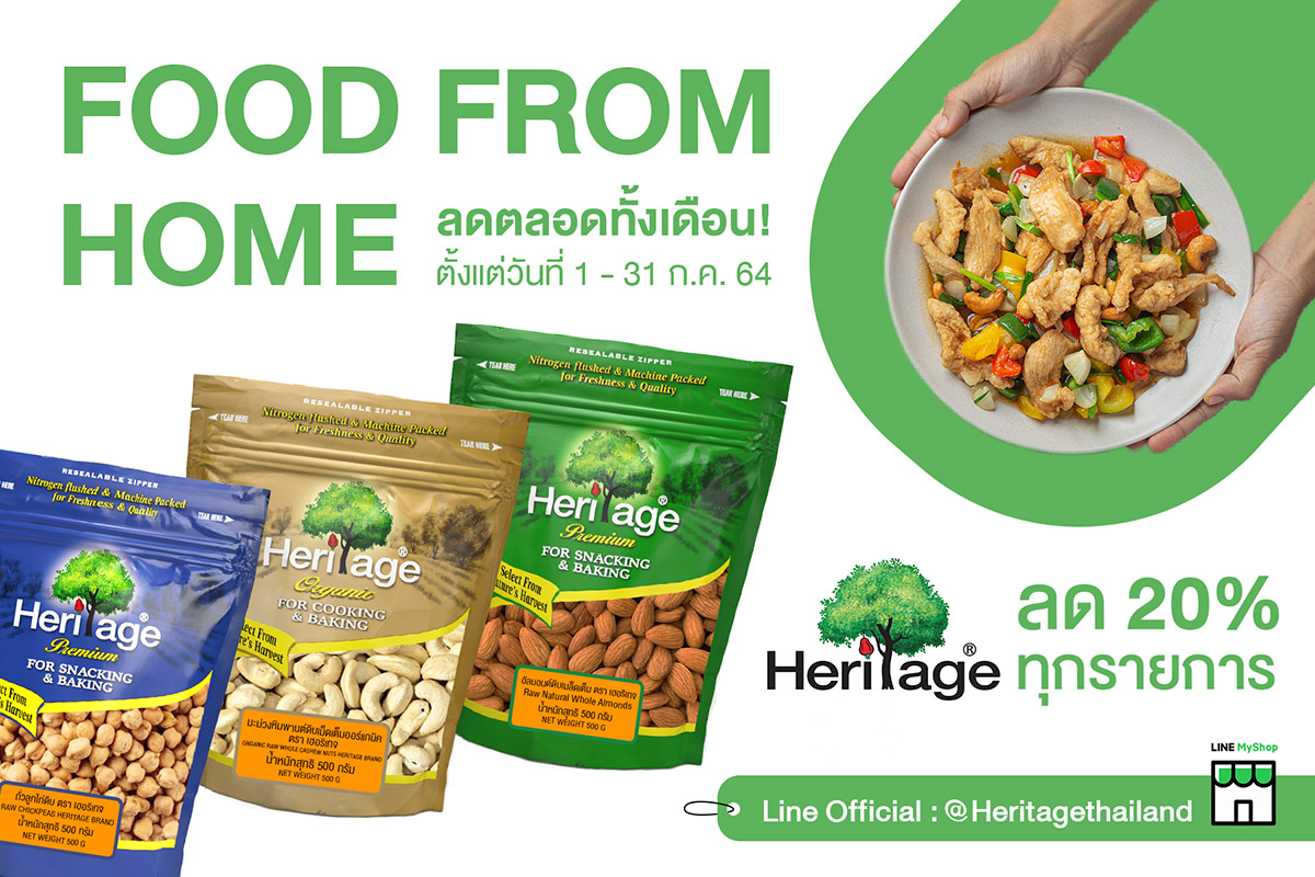 มิติหุ้น – เครือเฮอริเทจ ผู้ผลิตและจัดจำหน่ายอาหารและเครื่องดื่มเพื่อสุขภาพ จัดโปรโมชั่นลดราคา 20% ทุกรายการให้คุณช้อปอยู่บ้านอย่างปลอดภัยด้วยผลิตภัณฑ์ถั่ว ธัญพืช ผลไม้อบแห้งพรีเมี่ยมและผลิตภัณฑ์ออร์แกนิค นานาชนิดของแบรนด์ “เฮอริเทจ” อาทิ อัลมอนด์, วอลนัท, ฮาเซลนัท, ลูกฟิก, ลูกพรุน, เมล็ดฟักทองอบ, พิสทาชิโอ, อินทผาลัม, มะม่วงหิมพานต์, แมคคาเดเมีย, ลูกเกดดำ, เมล็ดเจีย, เมล็ดข้าวโพดดิบพันธุ์มัชรูม, ถั่วลูกไก่ดิบ, ข้าวบาร์เลย์, ถั่วดำญี่ปุ่น, เก๋ากี้อบแห้ง, คีนัวออร์แกนิค, แครนเบอร์รี่แห้งออร์แกนิค และอีกหลากหลายรายการ