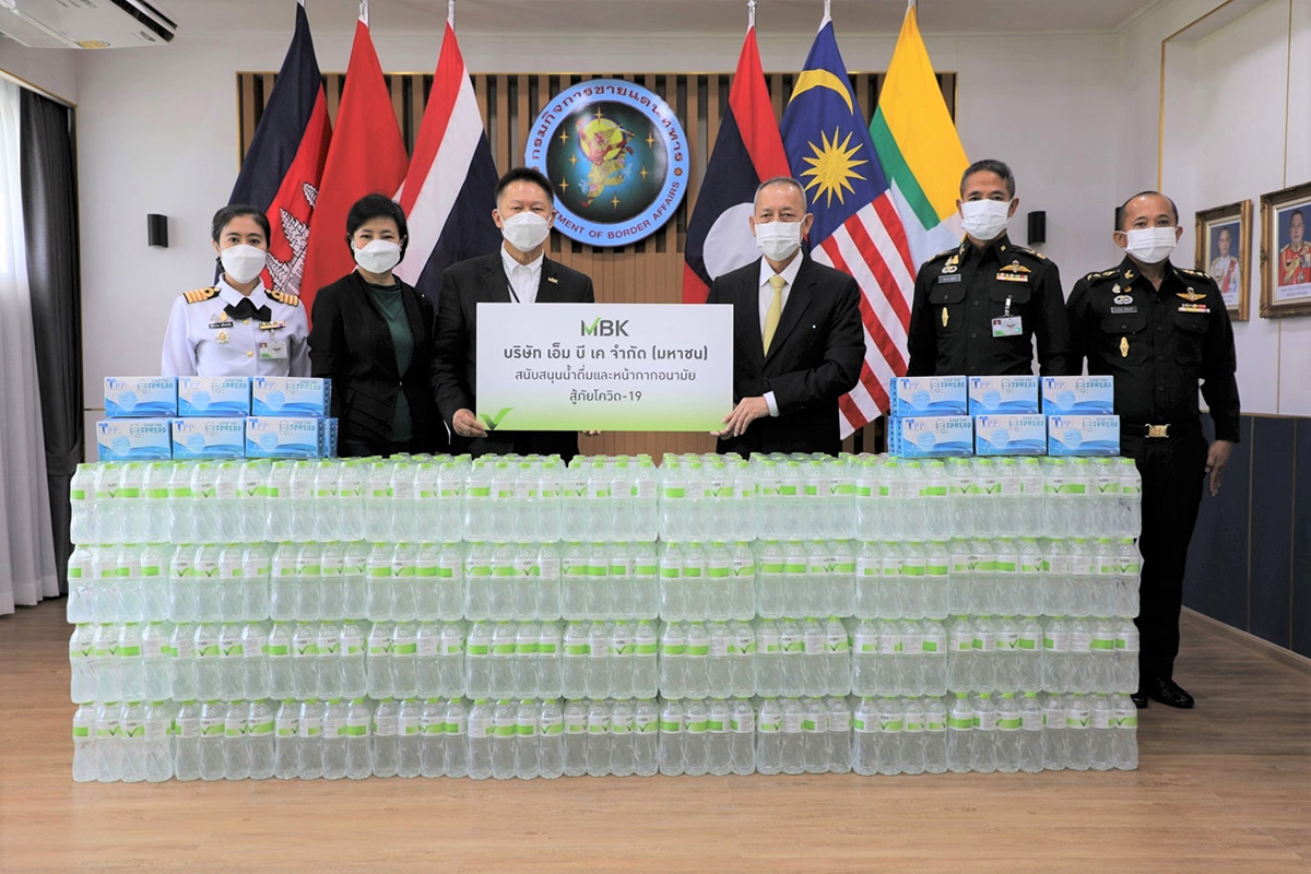มิติหุ้น – บริษัท เอ็ม บี เค จำกัด (มหาชน) นำโดย นายสมพล ตรีภพนารถ (ที่ 3 จากซ้าย) กรรมการผู้จัดการธุรกิจศูนย์การค้า พร้อมด้วย นางสาวศตกมล วรกุล (ที่ 2 จากซ้าย) ผู้อำนวยการฝ่ายสื่อสารองค์กร บริษัท เอ็ม บี เค จำกัด (มหาชน) ร่วมมอบน้ำดื่ม MBK จำนวน 5,000 ขวด และหน้ากากอนามัย จำนวน 5,000 ชิ้น ให้กับกรมกิจการชายแดนทหาร เพื่อนำไปช่วยเหลือประชาชนและโรงเรียนตามแนวชายแดนไทยกับประเทศเพื่อนบ้าน ที่ได้รับผลกระทบจากสถานการณ์การแพร่ระบาดโควิด-19 ผ่านมูลนิธิเพื่อการศึกษาบริเวณชายแดน โดยมี พลเอกธิวา เพ็ญเขตกรณ์ (ที่ 4 จากซ้าย) ผู้อำนวยการหลักสูตรการบริหารความมั่นคงสำหรับผู้บริหารระดับสูง SML พลตรีกังวาน สุจินต์ (ที่ 5 จากซ้าย) ผู้อำนวยการสำนักปฏิบัติการเพื่อความมั่นคง พันเอกบรรลุ เอี่ยมศรี (ที่ 6 จากซ้าย) รองผู้อำนวยการสำนักปฏิบัติการเพื่อความมั่นคง เป็นผู้รับมอบ ณ กรมกิจการชายแดนทหาร กองบัญชาการกองทัพไทย เมื่อเร็ว ๆ นี้