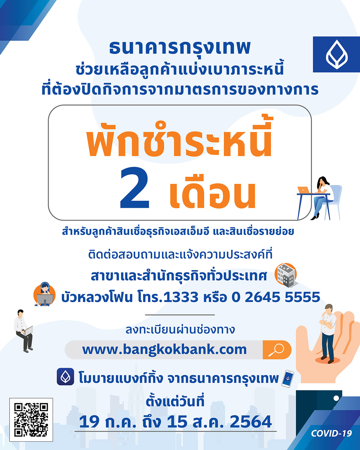 สำหรับลูกค้าที่ได้รับผลกระทบสามารถตรวจสอบรายละเอียดเพิ่มเติมเกี่ยวกับมาตรการช่วยเหลือ และติดต่อขอรับความช่วยเหลือได้ที่ สำนักธุรกิจและสาขาธนาคารทั่วประเทศ และบัวหลวงโฟน โทร.1333 หรือ 0 2645 5555 โดยเฉพาะอย่างยิ่งเพื่อป้องกันความเสี่ยง สามารถลงทะเบียนได้ทางเว็บไซต์ https://www.bangkokbank.com/COVID19-Update หรือ QR Code ตามแนบ หรือโมบายแบงก์กิ้ง จากธนาคารกรุงเทพ ขณะเดียวกันลูกค้าที่ไม่ได้รับผลกระทบรุนแรงหรือมีความสามารถผ่อนชำระสินเชื่อได้เช่นเดิม ยังคงสามารถใช้บริการและชำระสินเชื่อต่างๆ ได้ตามปกติ