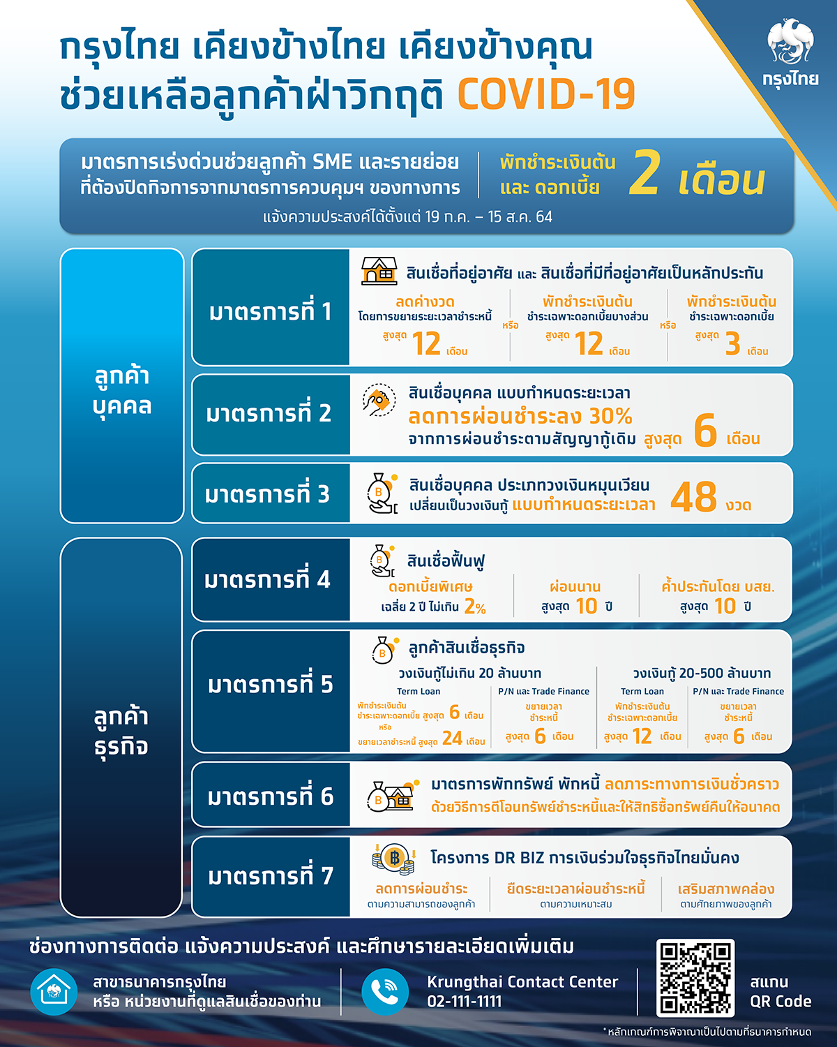 สำหรับลูกค้าที่สนใจศึกษาข้อมูลมาตรการช่วยเหลือของธนาคารที่ www.krungthai.com/link/covid-19 หรือสอบถามเพิ่มเติมได้ที่ ธนาคารกรุงไทยทุกสาขา หน่วยงานที่ดูแลสินเชื่อของท่าน หรือ Krungthai Contact Center 02-111-1111
