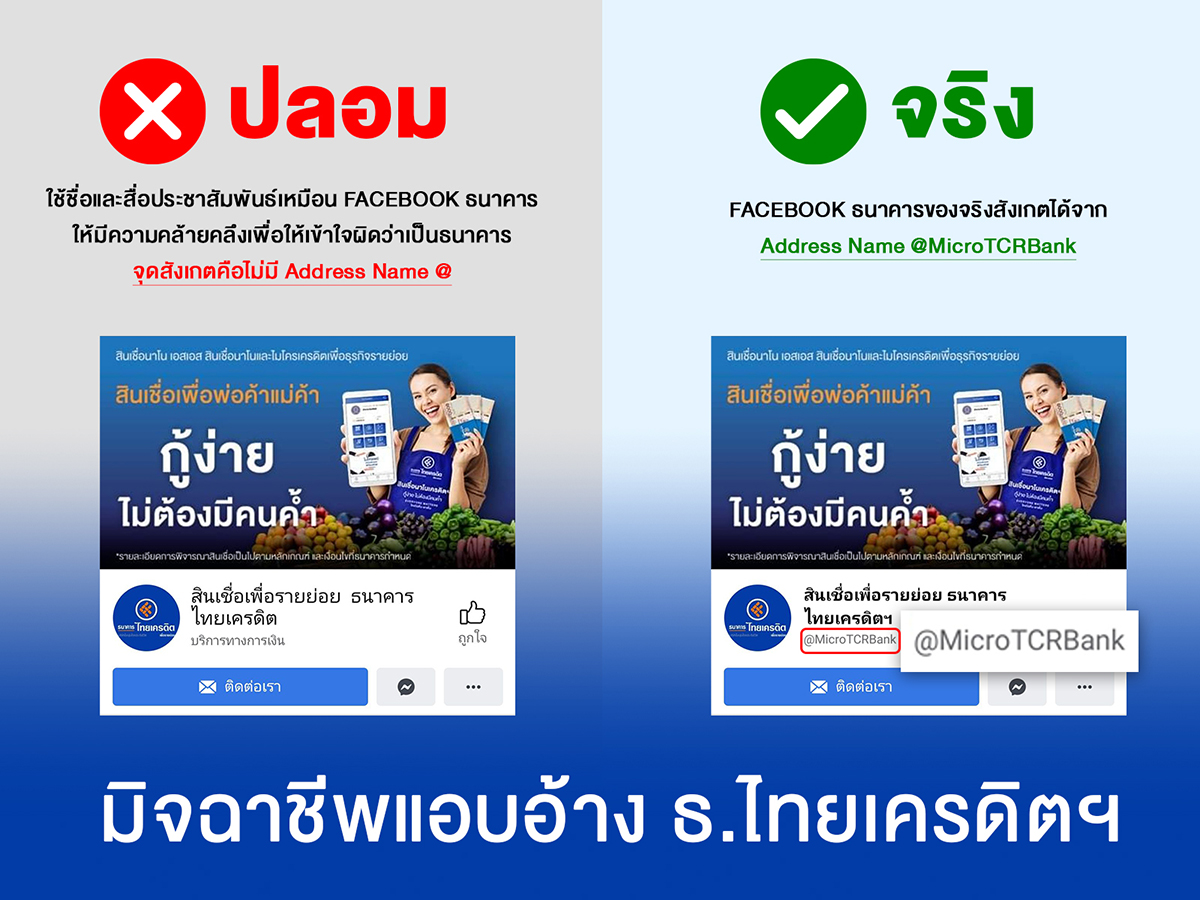 มิติหุ้น – ธนาคารไทยเครดิต เพื่อรายย่อย จำกัด (มหาชน) แจ้งเตือนลูกค้า ระวังเว็บไซต์ เพจเฟซบุ๊ก หรือ Line ID ปลอม เปิดให้บริการเงินกู้ โดยแอบอ้างชื่อและโลโก้นายรอย ออกุสตินัส กุนารา กรรมการผู้จัดการ ธนาคารไทยเครดิต เพื่อรายย่อย จำกัด (มหาชน) ชี้แจงว่า “ธนาคารได้รับรายงานว่า มีผู้ไม่หวังดีนำชื่อหรือโลโก้ ของธนาคารไปแอบอ้างในเว็บไซต์ เพจเฟซบุ๊ก หรือ Line ID ให้บริการเงินกู้ ทำให้เกิดความสับสนและความเข้ าใจผิดแก่ผู้สนใจสินเชื่อ รวมถึงลูกค้าของธนาคาร ธนาคารจึงขอเรียนชี้แจงว่า เว็บไซต์ เพจเฟซบุ๊ก และ Line ID ดังกล่าวไม่มีความเกี่ยวข้องใดๆ กับธนาคารไทยเครดิต เพื่อรายย่อย ทั้งสิ้น และธนาคารไม่มีนโยบายให้บุ คคลภายนอกจัดทำเว็บไซต์ ผลิตสื่อ จัดทำเพจเฟซบุ๊กหรือ Line ID ใดๆ โดยแอบอ้างชื่อธนาคารไปใช้ หาผลประโยชน์ ทั้งนี้ธนาคารอยู่ระหว่างการพิ จารณาดำเนินการเอาผิดตามกฎหมาย จึงขอความกรุณาลูกค้ าธนาคารและผู้สนใจสินเชื่ออย่ าหลงเชื่อข้อมูลจากเว็บไซต์ เพจเฟซบุ๊ก และ Line ID ดังกล่าว”