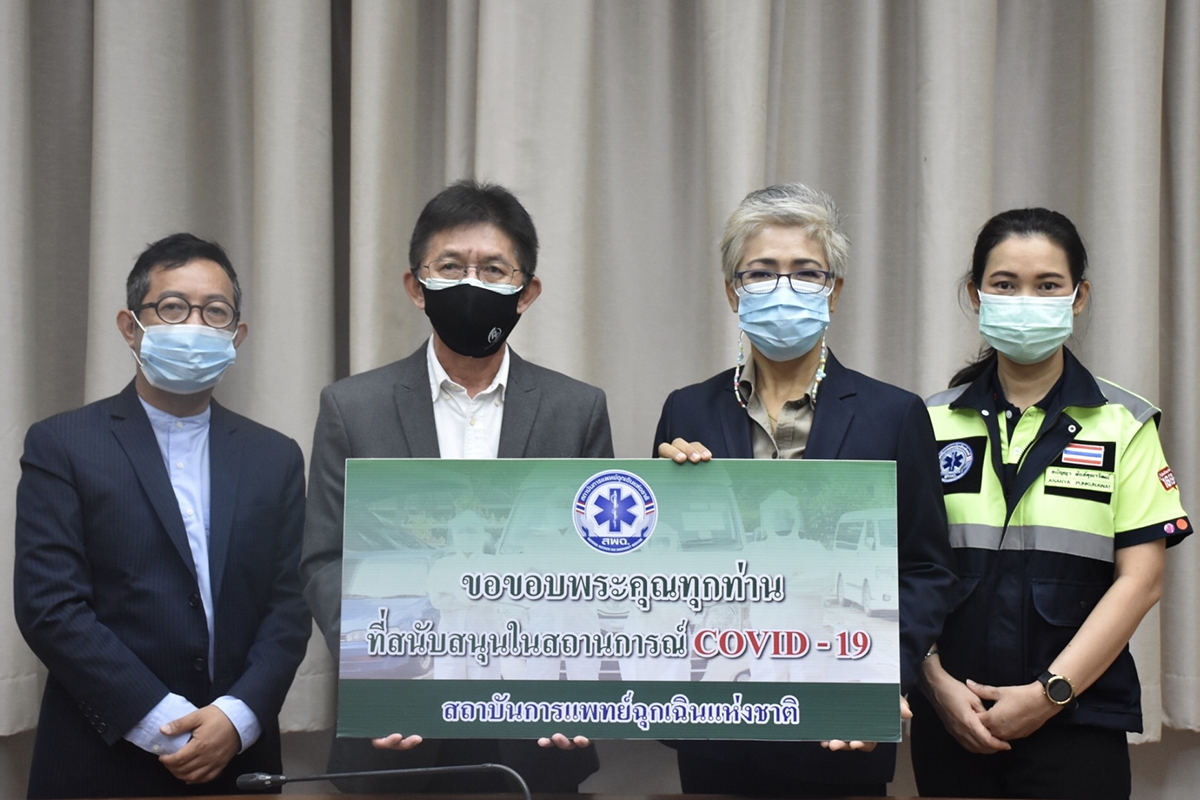 มิติหุ้น – นางวนิชยา ทองแนบ (ที่ 2 จากขวา) ผู้อำนวยการสำนักบริหารกลาง สถาบันการแพทย์ฉุกเฉินแห่งชาติ หรือ สพฉ. ขอขอบคุณ นายฉลอง ติรไตรภูษิต (ที่ 2 จากซ้าย) ผู้อำนวยการฝ่ายสื่อสารองค์กร บริษัท พีทีจี เอ็นเนอยี จำกัด (มหาชน) หรือ PTG ที่ได้มอบคูปองเติมน้ำมัน PT จำนวน 1,000 ใบ ใบละ 100 บาท รวมมูลค่า 100,000 บาท เพื่อสนับสนุนค่าเชื้อเพลิงสำหรับยานพาหนะที่ปฏิบัติภารกิจ รับ-ส่ง ผู้ป่วยโควิด-19 ร่วมกับ สพฉ. ซึ่งมีส่วนสำคัญอย่างยิ่งในการปฏิบัติงานด้านสาธารณสุขในภาวะฉุกเฉิน นำส่งผู้ป่วยโควิด-19 ที่รอเข้ารับการรักษาเป็นจำนวนมากต่อวันไปส่งโรงพยาบาล ในเขตกรุงเทพมหานคร และปริมณฑล ณ ตึกสำนักงานปลัดกระทรวงสาธารณสุข เมื่อเร็วๆ นี้