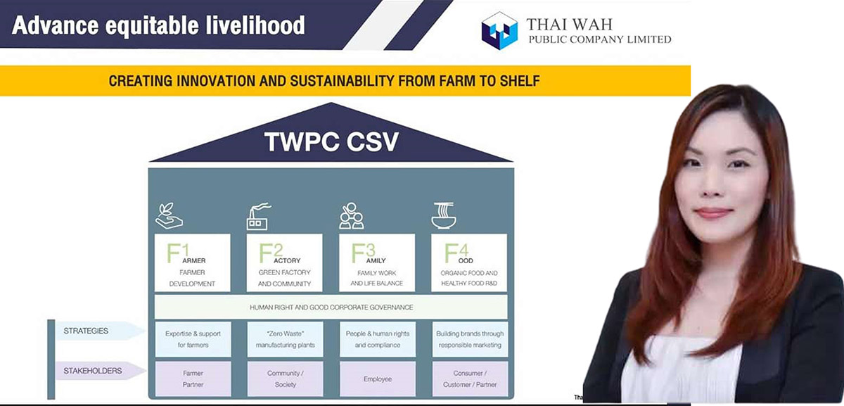 คุณรตินันทน์ วงศ์วัชรานนท์ ผู้จัดการอาวุโสฝ่ายสื่อสารองค์กรและพัฒนาความยั่งยืน บริษัท ไทยวา จำกัด (มหาชน) หรือ TWPC ผู้ผลิตและส่งออกผลิตภัณฑ์แป้งมันสำปะหลัง และผู้นำตลาด โดยเฉพาะผลิตภัณฑ์วุ้นเส้นและเส้นก๋วยเตี๋ยว เปิดเผยว่า ไทยวาดำเนินกลยุทธ์ความยั่งยืนหลัก คือ “การพัฒนาสร้างสรรค์นวัตกรรมและความยั่งยืนจากไร่ไปสู่ผู้บริโภค (Creating Innovation and Sustainability from Farm to Shelf)” ภายใต้ความยั่งยืนของธุรกิจ 4 เสาหลักหรือ F4 โดยคำนึงถึงความเป็นอยู่ที่ดีของผู้มีส่วนได้ส่วนเสียทุกภาคส่วนที่เกี่ยวข้องตลอดห่วงโซ่อุปทานอาหาร ตั้งแต่ F1: Farm การพัฒนาเกษตรกร, F2: Factory โรงงานสีเขียว / zero waste และการพัฒนาชุมชน, F3: Family การพัฒนาคุณภาพชีวิตครอบครัวไทยวา และ F4: Food การวิจัยอาหารเพื่อสุขภาพของผู้บริโภค