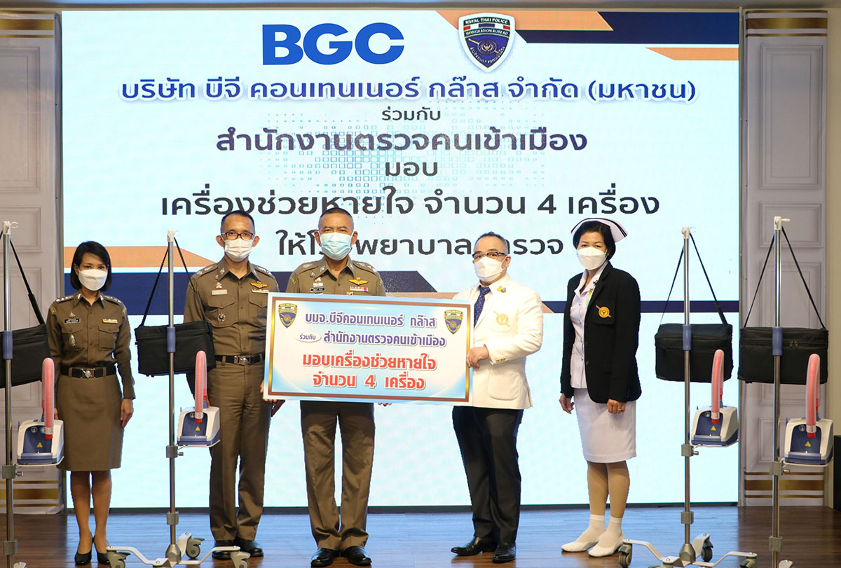 มิติหุ้น – บริษัท บีจี คอนเทนเนอร์ กล๊าส จำกัด (มหาชน) หรือ บีจีซี (BGC) ร่วมกับสำนักงานตรวจคนเข้าเมือง สนับสนุนเครื่องช่วยหายใจชนิดอัตราการไหลสูง (High Flow) ให้แก่โรงพยาบาลตำรวจ เพื่อนำไปใช้ในการรักษาผู้ป่วยโควิด-19 ที่อยู่ในภาวะวิกฤติ จำนวน 4 เครื่อง มูลค่า 800,000 บาท โดยมี พล.ต.ท.สมพงษ์ ชิงดวง ผบช.สตม. พร้อมด้วย พล.ต.ต.ภานุวัฒน์ ร่วมรักษ์ ผบก.อก.สตม. เป็นตัวแทน มอบให้แก่ พล.ต.ท.โสภณรัชต์ สิงหจารุ นายแพทย์ใหญ่โรงพยาบาลตำรวจ ณ ชั้น 2 อาคารมหาภูมิพลราชานุสรณ์ 88 พรรษา โรงพยาบาลตำรวจ