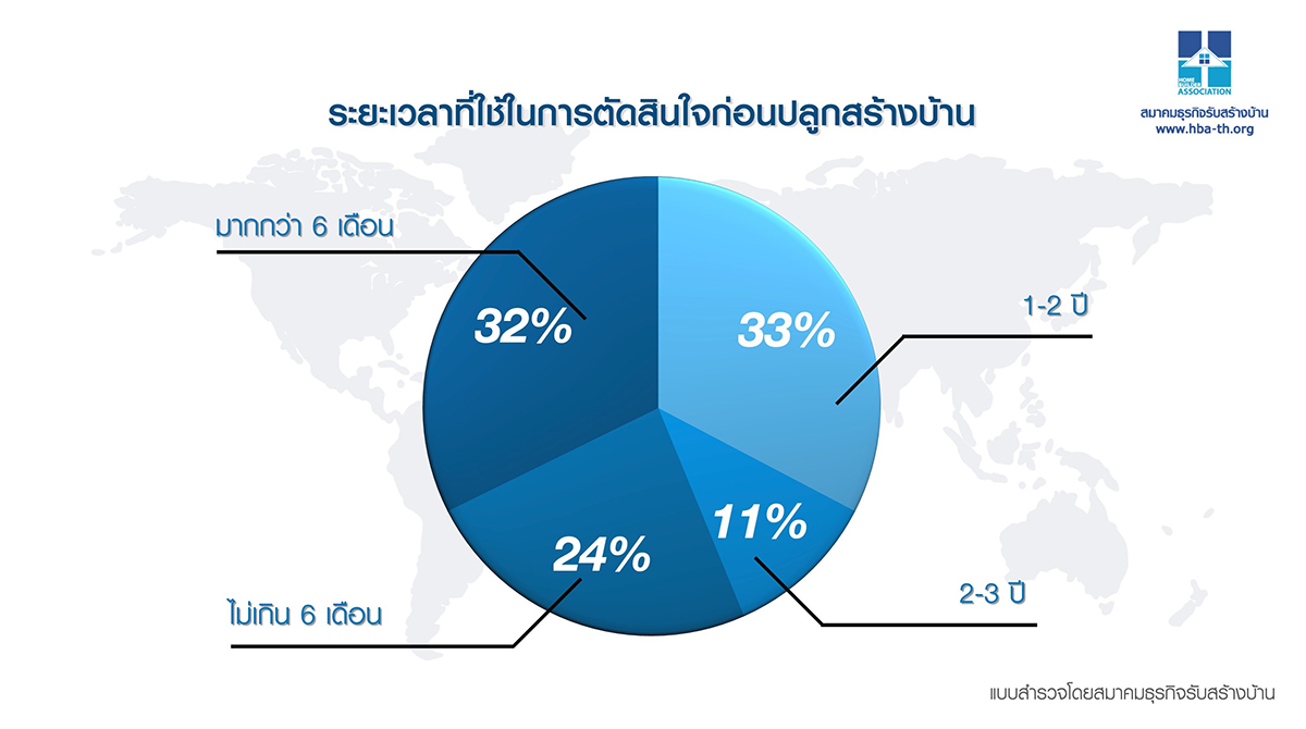➢ เมื่อถามว่าต้องการจะปลูกสร้างบ้านพร้อมเข้าอยู่ใช้เวลาในการปลูกสร้างกี่ปีนั้น พบว่าพร้อมปลูกสร้างไม่เกิน 6 เดือนคิดเป็นสัดส่วน 24% และใช้เวลามากกว่า 6 เดือนถึง 2 ปีคิดเป็นสัดส่วน 65% และ ใช้เวลา 2-3 ปี คิดเป็นสัดส่วน 11% ตามลำดับ แสดงให้เห็นว่าผู้ที่ต้องการสร้างบ้านส่วนใหญ่ จะไปสร้างบ้านในปี 2565- 2566 ซึ่งเป็นช่วงที่การแพร่ระบาดของโควิด-19 น่าจะคลายตัวลงแล้ว