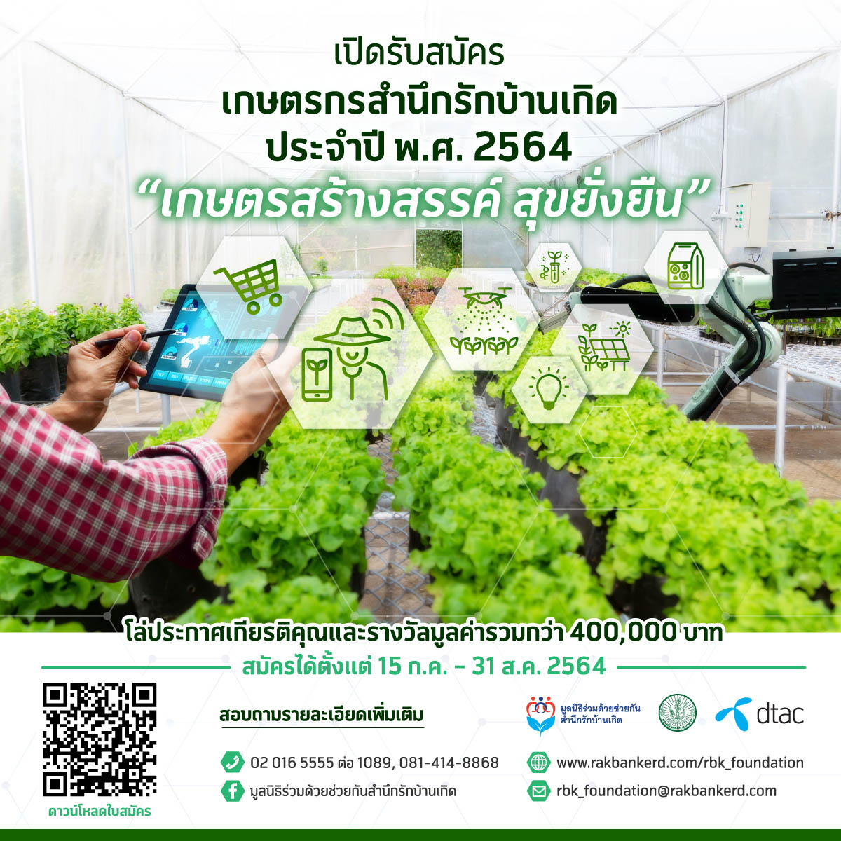 มิติหุ้น – มูลนิธิร่วมด้วยช่วยกันสำนึกรักบ้านเกิด ร่วมกับกรมส่งเสริมการเกษตร และดีแทค (DTAC) ขอเชิญชวนเกษตรกรเข้าร่วม “โครงการคัดเลือกเกษตรกรสำนึกรักบ้านเกิด ประจำปี พ.ศ.2564” ภายใต้แนวคิด “เกษตรสร้างสรรค์ สุขยั่งยืน” เพื่อสนับสนุนเกษตรกรที่มีแนวความคิดและการปฏิบัติด้านเกษตรอินทรีย์ โดยสามารถนำองค์ความรู้ต่างๆ มาพัฒนาและต่อยอดเพื่อเพิ่มมูลค่าให้ผลผลิต รวมไปถึงการสร้างความมั่นคงยั่งยืน แก่คุณภาพชีวิตของตนเอง สังคม และชุมชน ซึ่งสอดคล้องกับนโยบายของภาครัฐในเรื่องเศรษฐกิจสู่การพัฒนาที่ยั่งยืน (Bio-Circular-Green Economy : BCG) ผู้ที่ได้รับคัดเลือกเป็นเกษตกรสำนึกรักบ้านเกิด จะได้รับโล่ประกาศเกียรติคุณและรางวัล มูลค่ารวมกว่า 400,000 บาท เปิดรับสมัครแล้วตั้งแต่วันนี้ – 31 สิงหาคม 2564 (ยึดตราประทับไปรษณีย์เป็นสำคัญ) สามารถดาวน์โหลดใบสมัคร และดูรายละเอียดโครงการ ได้ที่ www.rakbankerd.com/rbk_foundation/relation/open.php?id=57 หรือสอบถามรายละเอียดเพิ่มเติมได้ที่ โทร. 02-016-5555 ต่อ 1089 / 081-414-8868 และ E-mail: rbk_foundation@rakbankerd.com, Tawatchai_j@rakbankerd.com