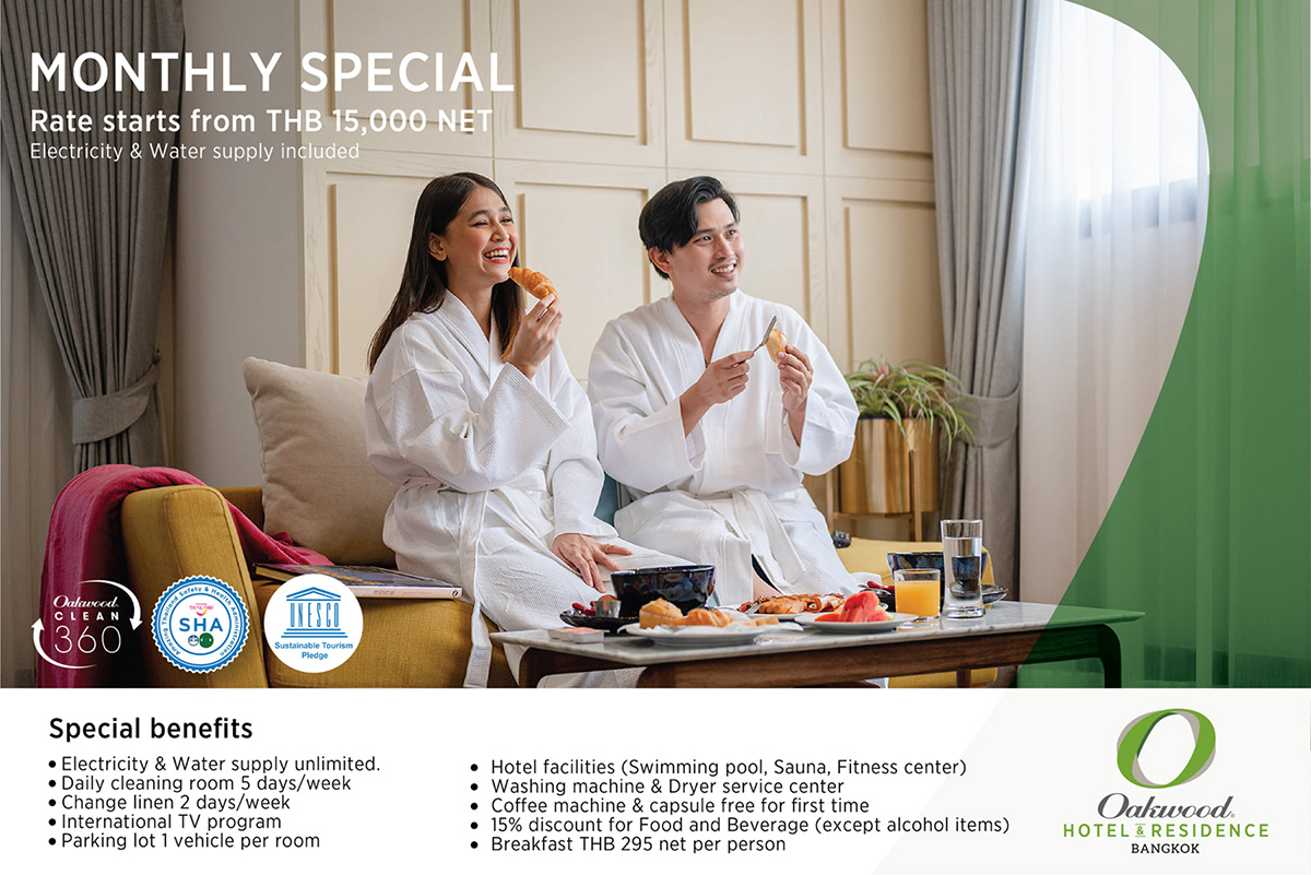 มิติหุ้น – โอ๊ควู๊ด โฮเทล แอนด์ เรสซิเด้นซ์ กรุงเทพ โรงแรมใหม่ล่าสุดใจกลางย่านเศรษฐกิจสาทร – เจริญกรุง ด้วยมาตรฐานการบริการระดับโลกภายใต้แบรนด์ “Oakwood” ใกล้ BTS สะพานตากสินเพียง 200 เมตร ส่งโปรโมชั่น“MONTHLY SPECIAL” แพกเกจเหมาเดือนสุดคุ้ม! เอาใจคน Work from Home ที่อยากสร้างบรรยากาศการทำงานและพักผ่อนไว้ในที่เดียวกัน สะดวกสบายเป็นส่วนตัวเสมือนอยู่บ้าน การเดินทางสะดวก และได้เว้นระยะห่างทางสังคมกับสมาชิกในครอบครัว ช่วยลดการแพร่กระจายเชื้อไวรัส Covid-19 กับห้องพักสบายๆ บริการระดับพรีเมียม สะอาด ปลอดภัย ได้รับการรับรองจาก SHA มั่นใจความปลอดภัยจาก Covid -19 ด้วยโปรแกรม Oakwood Clean 360 จัดเต็มด้วยสิ่งอำนวยความสะดวกครบครันทั้งเตียงนุ่มๆ ที่ถูกออกแบบดีไซน์เป็นพิเศษ, ห้องน้ำแยกส่วนเปียก-แห้ง, มีโต๊ะทำงาน, Smart TV พร้อมช่อง International, เครื่องทำกาแฟแคปซูล Espresso ทุกห้อง, มีแม่บ้านทำความสะอาด, มีจุดบริการเครื่องซักผ้า-เครื่องอบผ้า, ที่จอดรถ 1 คัน, ระบบรักษาความปลอดภัย 24 ชั่วโมง, ฟรี! ค่าน้ำและค่าไฟ, ฟรี! Wi Fi ความเร็วสูง และรับส่วนลด 15 % สำหรับอาหารและเครื่องดื่ม (ยกเว้นแอลกอฮอล์) ในราคาเริ่มต้นสุดพิเศษเพียง 15,000 บาท/เดือน ไม่มีค่ามัดจำล่วงหน้า เพียงชำระเต็ม 1 เดือนก่อนเข้าพัก (กรณีเข้าพักต่ำกว่า 3 เดือน) จองด่วน! ภายในวันที่ 19 สิงหาคม นี้เท่านั้น!!!