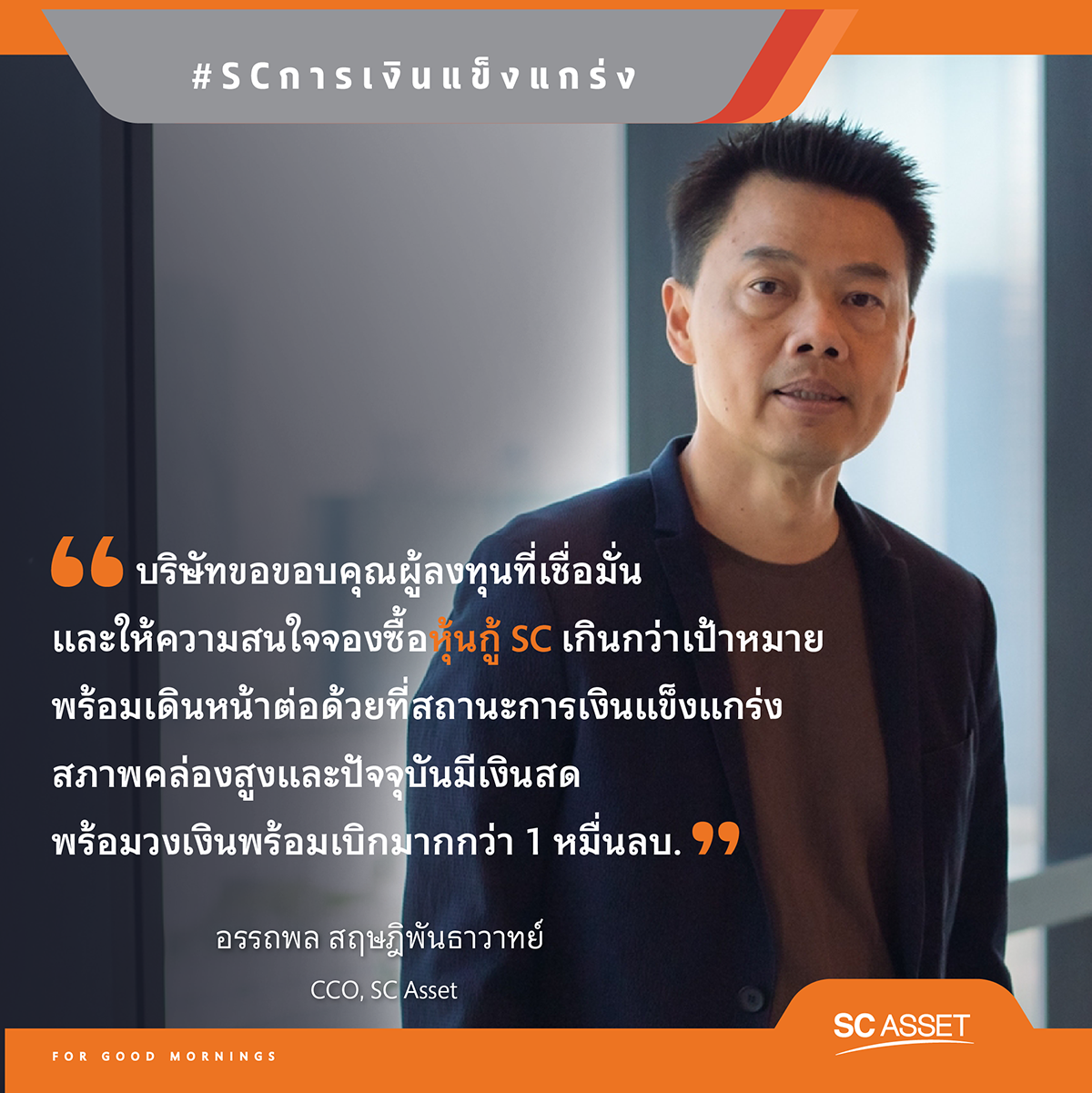 โดยนายอรรถพลกล่าวเพิ่มเติมว่า “ในปีนี้บริษัทได้ออกหุ้นกู้รวมทั้งสิ้น 3,000 ล้านบาท เพื่อใช้เป็นแหล่งเงินทุนในการดำเนินธุรกิจควบคู่ไปกับเงินกู้จากสถาบันการเงิน SC พร้อมเดินหน้าต่อ ด้วยสถานะการเงินที่แข็งแกร่งและ มีสภาพคล่องสูง ปัจจุบันบริษัทมีเงินสดพร้อมวงเงินพร้อมเบิกมากกว่า 10,000 ล้านบาท มั่นใจว่าผลการดำเนินงานปีนี้จะทำได้ตามเป้าหมาย”