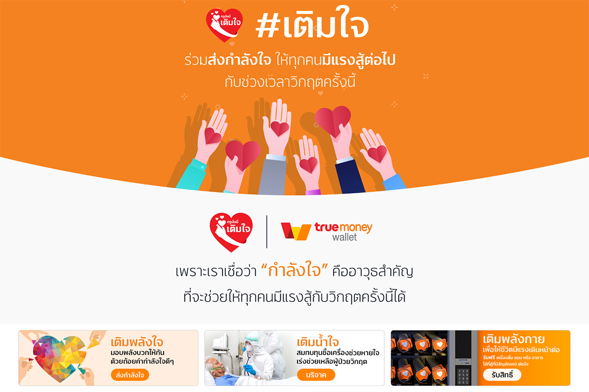 3) “เติมน้ำใจ” : ทรูมันนี่ รวบรวมรายชื่อมูลนิธิและโครงการต่าง ๆ ที่ช่วยเหลือบุคลากรทางการแพทย์และผู้ป่วยโควิด-19 รวมทั้งเปิดช่องทางบริจาคสมทบทุนช่วยเหลือมูลนิธิและโครงการเหล่านี้ผ่านแอปฯ ทรูมันนี่ วอลเล็ท อาทิ การระดมทุนจัดซื้อเครื่องช่วยหายใจแบบไฮโฟลว์และอุปกรณ์การแพทย์เพื่อช่วยเหลือโรงพยาบาลที่ขาดแคลนในการใช้ต่อลมหายใจผู้ป่วย ภายใต้โครงการ “ทุก(ข์)ภัยไทยช่วยกัน” โดยมูลนิธิหลักประกันสุขภาพไทย ซึ่งได้ส่งมอบเครื่องช่วยหายใจและอุปกรณ์การแพทย์ให้โรงพยาบาลต่าง ๆ ในพื้นที่ควบคุมสูงสุดและเข้มงวดไปแล้วบางส่วน โดยทรูมันนี่ยังเปิดรับบริจาคเพื่อซื้ออุปกรณ์ดังกล่าวเพิ่มเติมเนื่องจากยังคงมีโรงพยาบาลที่ขาดแคลน ทั้งนี้ ผู้มีจิตศรัทธาสามารถเข้าไปในแอปฯ ทรูมันนี่ วอลเล็ท เพื่อดูรายชื่อมูลนิธิและโครงการต่าง ๆ ที่สนใจเพื่อร่วมบริจาคได้