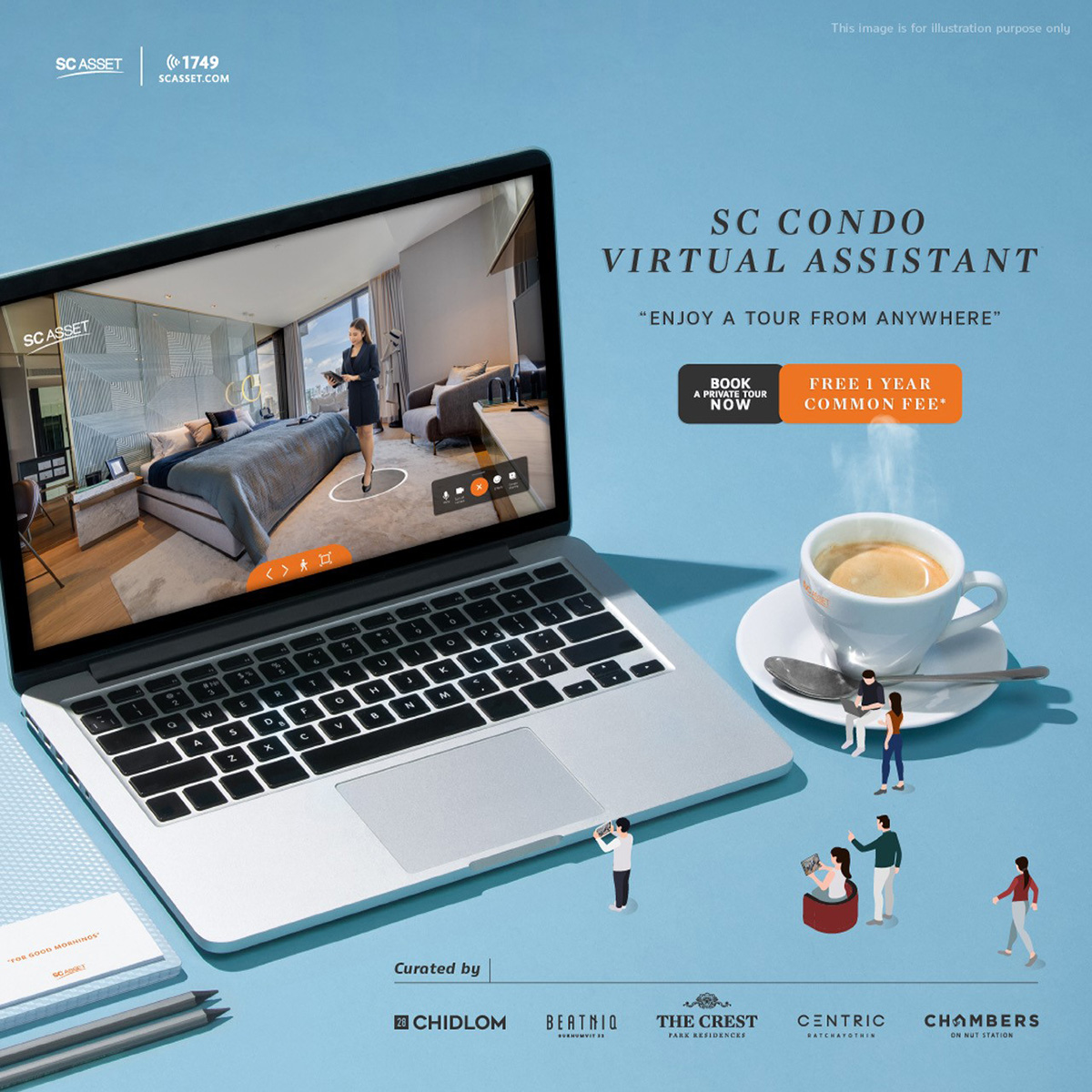 ดังนั้นไม่ว่าจะอยู่ที่ไหนก็ตาม ‘SC Condo Virtual Assistant’ จะพาชมโครงการ ได้ทุกจุดเสมือน walk–in แบบ 360 องศา พร้อมรับสิทธิพิเศษเมื่อลงทะเบียนนัดหมายชมโครงการกับ ‘SC Condo Virtual Assistant’ รับฟรีค่าส่วนกลางเพิ่ม 1 ปี