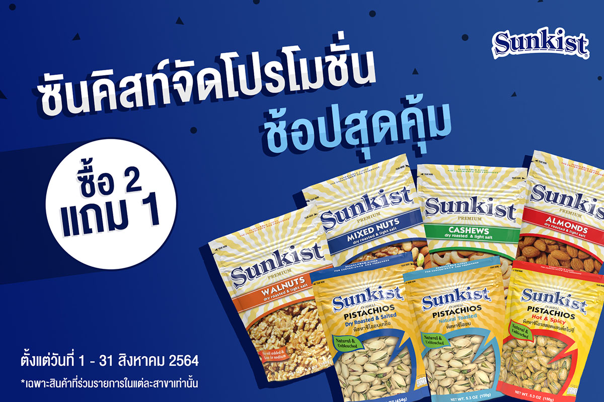 มิติหุ้น – ซันคิสท์ แบรนด์ผลิตภัณฑ์ถั่วพิสทาชิโอ และเครื่องดื่มน้ำนมพิสทาชิโอ ภายใต้เครือเฮอริเทจ จัดโปรโมชั่นช้อปสุดคุ้ม ซื้อ 2 แถม 1 ไปกับถั่วหลากหลายชนิด ได้แก่