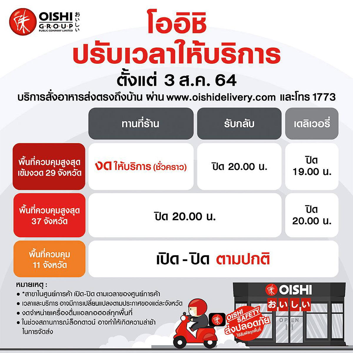 มิติหุ้น – ภายใต้สถานการณ์แพร่ระบาดในประเทศ และมาตรการความปลอดภัยต่าง ๆ “โออิชิ” เจ้าตำรับอาหารญี่ปุ่น ขออยู่เคียงข้างนักกินในทุกสถานการณ์ พร้อมปรับรูปแบบและเวลาให้บริการชั่วคราว สำหรับร้านอาหารญี่ปุ่นในเครือโออิชิ ที่มีสาขาหน้าร้าน รวมมากกว่า 200 แห่งทั่วประเทศ ตั้งแต่ 3 สิงหาคม 2564 เป็นต้นไป จนกว่าจะมีประกาศคำสั่งเปลี่ยนแปลง ดังนี้ (1) พื้นที่ควบคุมสูงสุดและเข้มงวด 29 จังหวัด : เปิดให้บริการเฉพาะแบบรับกลับ ถึงเวลา 20.00 น. และ จัดส่ง ถึงเวลา 19.00 น. เท่านั้น (2) พื้นที่ควบคุมสูงสุด 37 จังหวัด : เปิดให้บริการแบบทานที่ร้าน, รับกลับ, และ จัดส่ง ถึงเวลา 20.00 น. และ (3) พื้นที่ควบคุม 11 จังหวัด : เปิด – ปิดตามปกติ