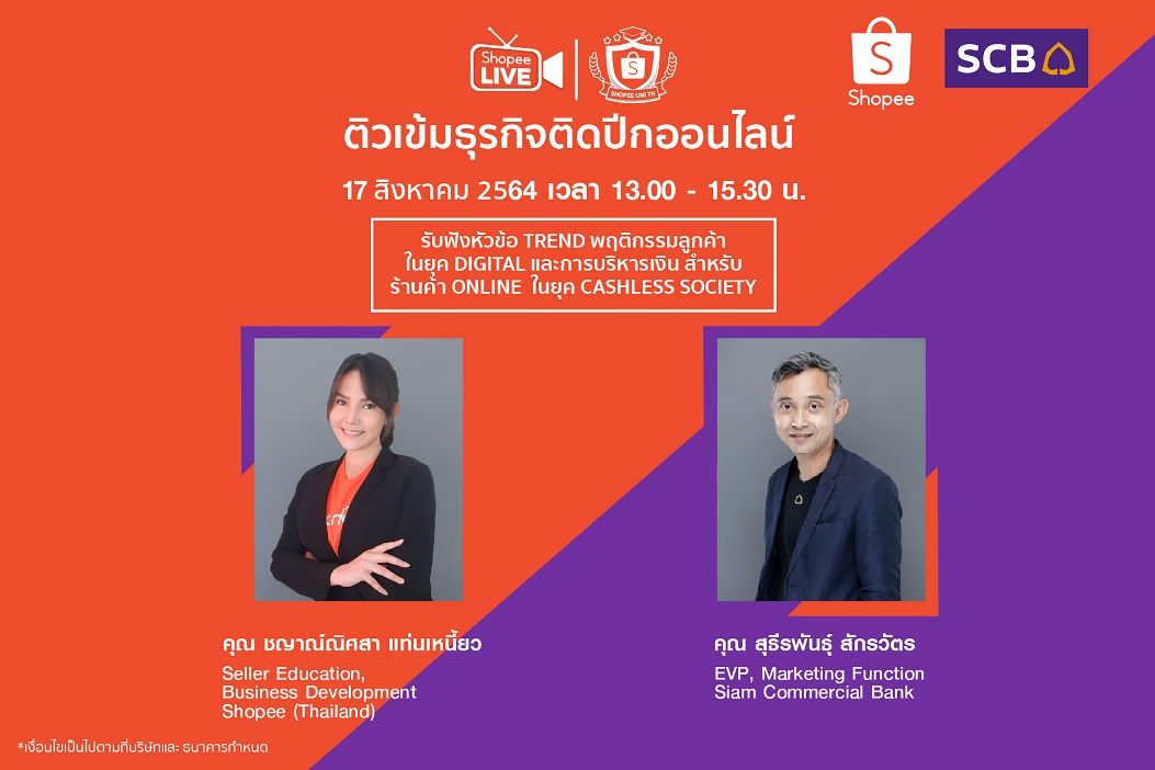 สามารถเข้าถึงสินเชื่อได้อย่างต่อเนื่อง ล่าสุดจับมือ บริษัท ช้อปปี้ (ประเทศไทย) จำกัด (Shopee) ผู้นำอีคอมเมิร์ซแพลตฟอร์มในภูมิภาคเอเชียตะวันออกเฉียงใต้และไต้หวัน เตรียมจัดงานสัมมนาสุดเอ็กซ์คลูซีฟ “Shopee University: Financial Edition Virtual Livestream 2021” ติวเข้มธุรกิจติดปีกออนไลน์ ผ่านช่องทางออนไลน์ แก่ผู้ประกอบการรายย่อย และพ่อค้าแม่ค้าออนไลน์ในช้อปปี้(Online seller) ซึ่งจัดขึ้นเป็นปีที่ 2 หลังจากได้รับการตอบรับอย่างท่วมท้นในครั้งที่ผ่านมา ภายในงานขนทัพวิทยากรชื่อดัง พร้อมกูรูด้านการตลาด ได้แก่ คุณสุธีรพันธุ์ สักรวัตร ผู้ช่วยผู้จัดการใหญ่ ผู้บริหารสายงานการตลาด ธนาคารไทยพาณิชย์ และคุณชญาณ์ณิศสา แท่นเหนี้ยว Seller Education, Business Development บริษัท ช้อปปี้ (ประเทศไทย) จำกัด มาร่วมพูดคุย เจาะลึกทุกประเด็นสำคัญ พร้อมเสริมทักษะการทำธุรกิจบนแพลตฟอร์มออนไลน์ในยุค New Normal ที่เติบโตขึ้นอย่างรวดเร็ว ครอบคลุมเทรนด์พฤติกรรมผู้บริโภคที่น่าสนใจในยุค Digital, วิธีบริหารเงินสำหรับร้านค้าออนไลน์ในยุคสังคมไร้เงินสด (Cashless Society) รวมถึงวิเคราะห์พฤติกรรมใช้จ่ายของคนไทยโดยไม่พึ่งเงินสด และการบริหารเงิน “ส่วนเกิน” และ “ส่วนขาด” เป็นต้น พร้อมแนะนำผลิตภัณฑ์ทางการเงินของธนาคารที่ตอบโจทย์การค้าขายของร้านค้าออนไลน์ในยุคสังคมไร้เงินสด ครอบคลุมทุกโซลูชันการเงินอันทันสมัยที่สามารถนำไปต่อยอดในการดำเนินธุรกิจได้ เช่น สินเชื่อมณีทันใจ เพื่อธุรกิจ, แอปแม่มณี, มณี Free Solution และ มณีมั่งคั่ง รวมไปถึงสินเชื่อสำหรับผู้ประกอบการรายย่อย เป็นต้น สำหรับผู้ประกอบการที่สนใจสามารถร่วมเข้าฟังสัมมนาฟรี! ในวันอังคารที่ 17 สิงหาคม 2564 ตั้งแต่เวลา 13.00 – 15.30 น. ผ่านทางแอปพลิเคชันช้อปปี้ โดยธนาคารมุ่งหวังให้การจัดงานสัมมนาในครั้งนี้จะสามารถช่วยเตรียมความพร้อมให้กลุ่มผู้ประกอบการรายย่อยสามารถปรับตัว พยุงธุรกิจให้สามารถก้าวข้ามผ่านช่วงเวลาที่ท้าทายเช่นนี้ไปได้ และกลับมามีรอยยิ้มอีกครั้ง