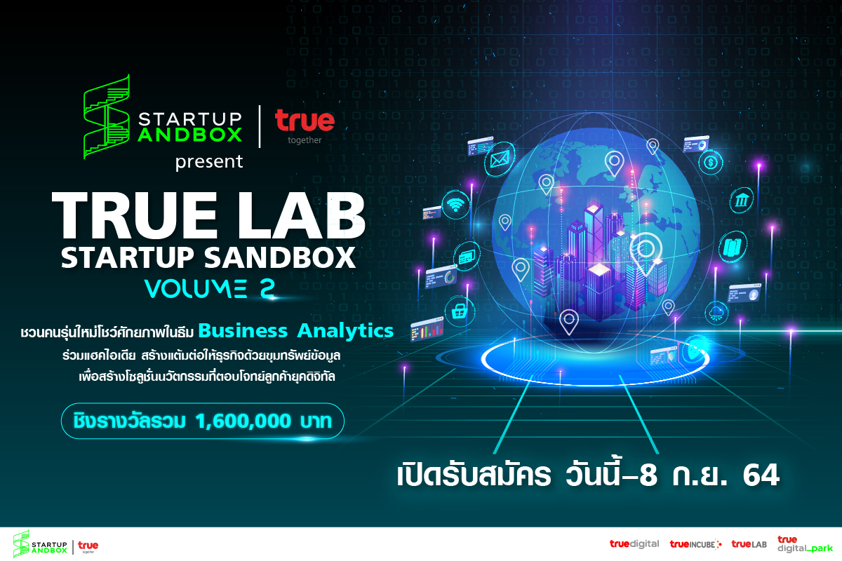 “True Lab Startup Sandbox Volume 2” จัดในรูปแบบออนไลน์ เปิดรับสมัครและคัดเลือก 10 ทีมที่จะได้เข้าประลองไอเดียในการแข่งขัน Hackathon เพื่อเฟ้นหา 4 ทีมสุดท้ายเข้าสู่รอบ Sandbox ระยะเวลา 3 เดือน ตั้งแต่วันที่ 22 กันยายน – 18 ธันวาคม 2564 รวมมูลค่ารางวัลตลอดโครงการทั้งสิ้น 1.6 ล้านบาท ดังนี้