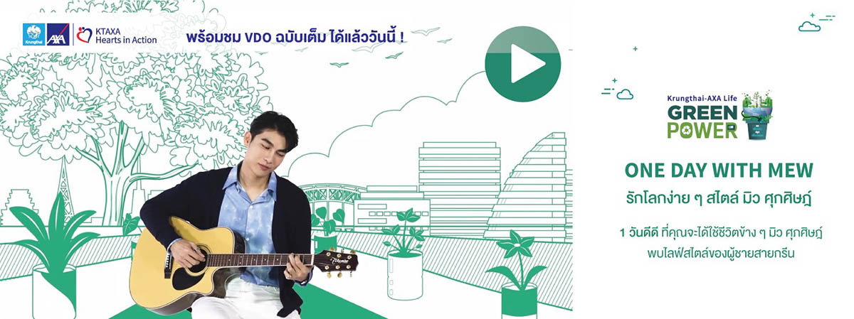 มิติหุ้น – บมจ.กรุงไทย-แอกซ่า ประกันชีวิต บริษัทประกันที่ใส่ใจสิ่งแวดล้อม “Green Insurer” และ กรีนเวฟ 106.5 เอฟเอ็ม เชื่อในพลังสีเขียว เชิญคุณพบไลฟ์สไตล์ของผู้ชายสายกรีนกับ “One Day with Mew” รักโลกง่ายๆ สไตล์มิว-ศุภศิษฏ์ จงชีวีวัฒน์ กับภารกิจสุดคิวท์ ดีดนิ้วกู้โลก ที่คุณจะได้ใช้ชีวิต 1 วันดีดี ข้างๆ มิว ศุภศิษฎ์ พร้อมบอกเคล็บลับดีๆ ในการประหยัดพลังงานไฟฟ้าแบบง่ายๆ ใน 1 วัน และขอเชิญชวนคุณร่วมลุ้นเป็นผู้โชคดีรับค่าไฟเดือนกรกฎาคม ฟรี! สามารถชมคลิปวิดีโอ “One Day with Mew” ได้แล้ววันนี้ ที่ https://www.facebook.com/Hearts.in.action.volunteers และขอขอบคุณทุกท่านที่ร่วมรีทวีตโพส จนถึง 100,000 รีทวีต ภายใน 1 ชั่วโมง และมุ่งหน้าสู่ 200,000 รีทวีต เพื่อเปลี่ยนเป็นการปลูกต้นไม้ 20,000 ต้น