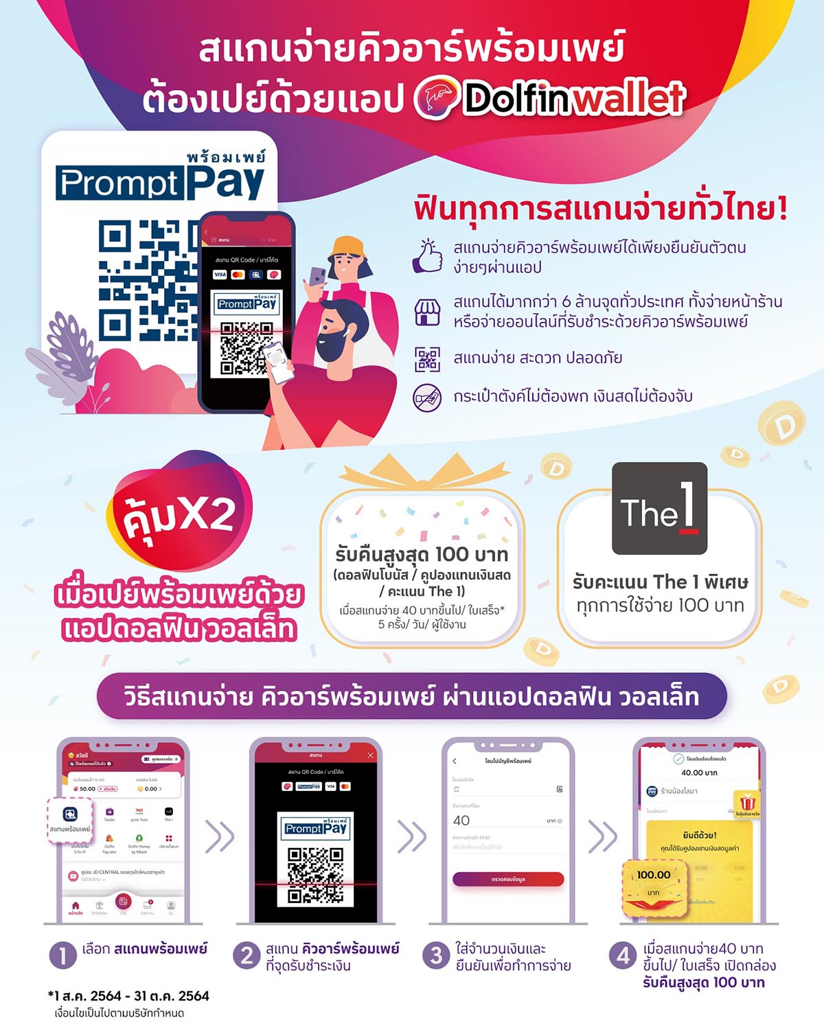 นอกจากนี้แอปดอลฟิน วอลเล็ทยังมอบสิทธิประโยชน์ให้กับลูกค้าเมื่อทำการสแกนจ่ายพร้อมเพย์ผ่านแอปดอลฟิน วอลเล็ท โดยลูกค้าจะได้รับสิทธิประโยชน์ถึงสองต่อ ด้วยการได้รับสิทธิเปิดกล่องของขวัญ (Fin Box) เพื่อลุ้นรับสิทธิประโยชน์ต่างๆ มูลค่าสูงสุด 100 บาท ซึ่งประกอบไปด้วยดอลฟินโบนัส คูปองแทนเงินสด และคะแนน The1 เมื่อสแกนจ่ายตั้งแต่ 40 บาทขึ้นไปต่อครั้ง จำกัด 5 สิทธิ์ / ลูกค้า / วัน พร้อมยังได้รับคะแนนสะสม The1 เมื่อสแกนจ่ายครบทุกๆ 100 บาทอีกด้วย ตั้งแต่วันที่ 1 สิงหาคม – 31 ตุลาคม 2564