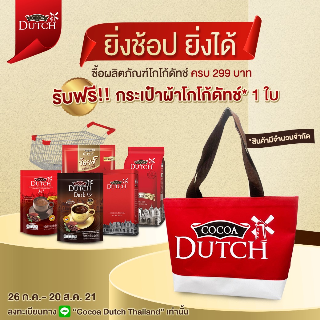 สัมผัสความหอม เข้ม ของโกโก้ดัทช์ 3in1 ทั้งสูตรใหม่ ดาร์ก 3in1 เข้มพิเศษ และสูตรออริจินัล หอม ละมุน กลมกล่อม พร้อมโปรโมชั่นพิเศษ เมื่อแอดไลน์เป็นสมาชิก Line “Cocoa Dutch Thailand” และซื้อโกโก้ดัทช์รุ่นใดก็ได้ ครบ 299 บาท/1 ใบเสร็จ รับฟรีทันที กระเป๋าผ้าโกโก้ดัทช์สุดพรีเมี่ยม! ได้ของรางวัลกันง่าย ๆ เพียงแค่ทำตามกติกาดังต่อไปนี้ วิธีร่วมสนุกง่าย ๆ เพียง คลิก https://bit.ly/3fADsDw