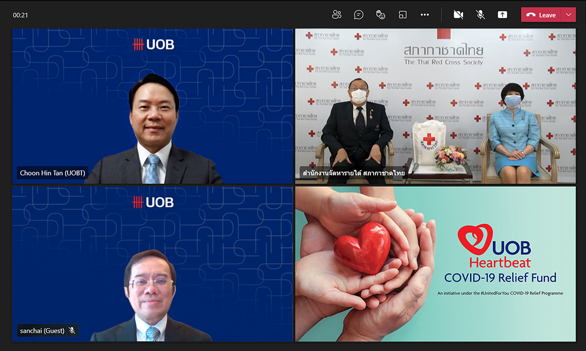 มิติหุ้น – มร. ตัน ชุน ฮิน กรรมการผู้จัดการใหญ่ ธนาคารยูโอบี ประเทศไทย (ซ้ายบน) และนายสัญชัย อภิศักดิ์ศิริกุล กรรมการรองกรรมการผู้จัดการใหญ่ การเงินและสนับสนุนธุรกิจธนาคาร ธนาคารยูโอบี ประเทศไทย (ซ้ายล่าง) กล่าวขอบคุณสภากาชาดไทยที่มุ่งมั่นจัดสรรชุดอุปกรณ์ยังชีพแก่ผู้ยากไร้ในระหว่างการมอบเงินบริจาคในโครงการยูโอบี ฮาร์ทบีท เพื่อสู้ภัยโควิด-19 ผ่านการประชุมออนไลน์แก่สภากาชาดไทย โดยมีนายขรรค์ ประจวบเหมาะ ผู้อำนวยการสำนักงานจัดหารายได้ และนางจันทร์ประภา วิชิตชลชัย รองผู้อำนวยการ สำนักงานจัดหารายได้ สภากาชาดไทย (ขวาบน) เป็นผู้แทนรับมอบ