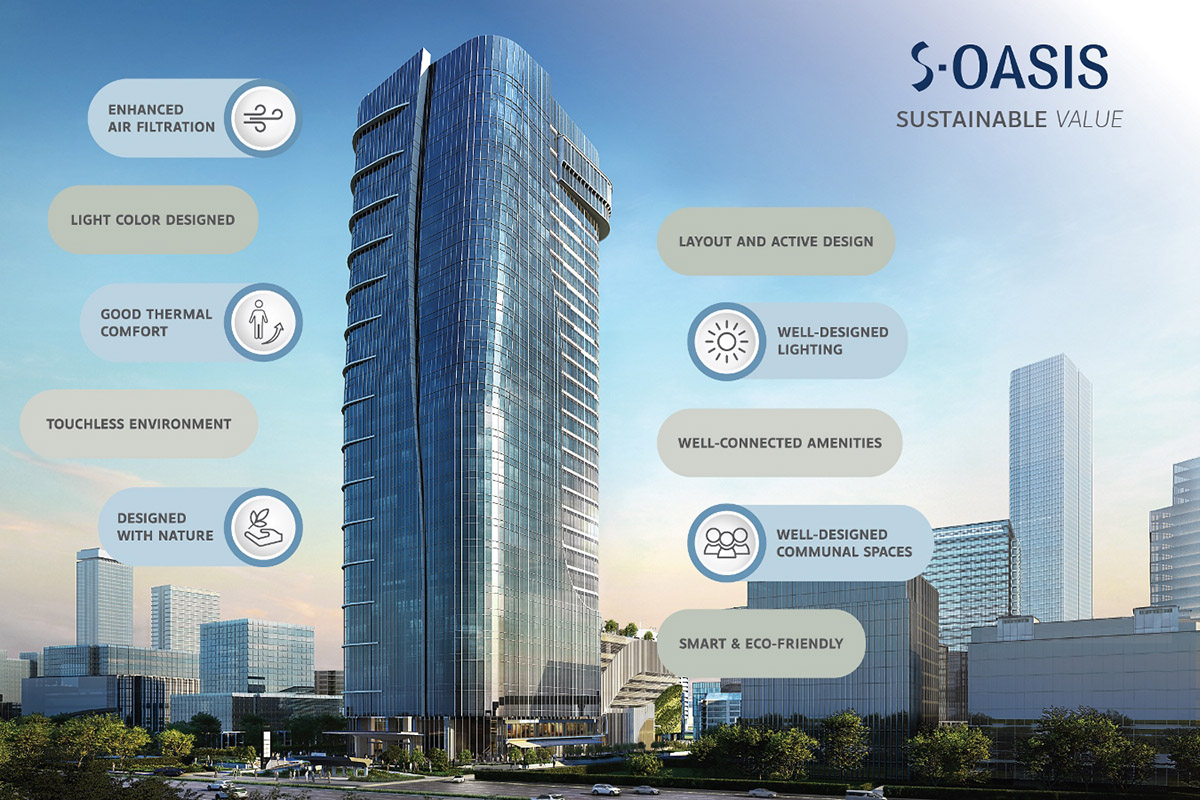 “เอส โอเอซิส” (S Oasis) คือ อาคารสำนักงานในฝันของคนรุ่นใหม่ โดยนางอรณีย์ พูลขวัญ ประธานเจ้าหน้าที่บริหาร ฝ่ายพัฒนาธุรกิจค้าปลีก และการพาณิชย์ บริษัท สิงห์ เอสเตท จำกัด(มหาชน) กล่าวถึงโครงการนี้ว่า เอส โอเอซิส ถูกพัฒนาขึ้นจากแนวคิดอาคารอัจฉริยะ และเป็นมิตรกับสิ่งแวดล้อม (Smart and Eco-friendly Building) เน้นการออกแบบเพื่อสร้างสภาพแวดล้อมให้เอื้อต่อการสร้างสรรค์งาน และบรรยากาศการทำงานที่มีชีวิตชีวา (Innovative Ecosystem) ซึ่งโครงการเอส โอเอซิส นอกจากจะตั้งอยู่ในทำเลที่มีศักยภาพสูงแล้ว การออกแบบได้ยึดตามมาตรฐาน LEED (Leadership in Energy & Environmental Design) ที่ให้ความสำคัญกับการอนุรักษ์พลังงาน และสิ่งแวดล้อม เลือกใช้วัสดุที่มีมลพิษต่ำ ควบคุมการก่อสร้างอย่างมีมาตรฐาน เพื่อเพิ่มความปลอดภัย ประสิทธิภาพในการทำงาน สู่การเป็น Sustainable Office ชั้นนำของไทย