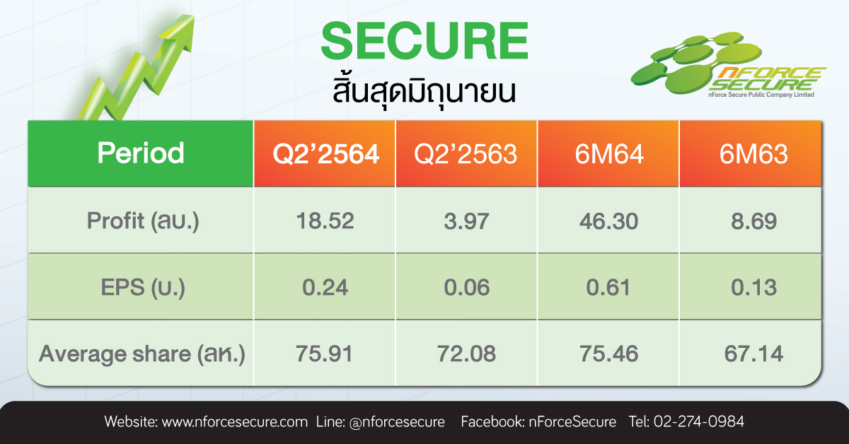 มิติหุ้น – บริษัท เอ็นฟอร์ซ ซีเคียว จำกัด (มหาชน) หรือ SECURE รายงานผลการดำเนินงานงวดไตรมาส 2 และงวดครึ่งปีแรกของปี 2564 มีกำไรสุทธิ ดังนี้