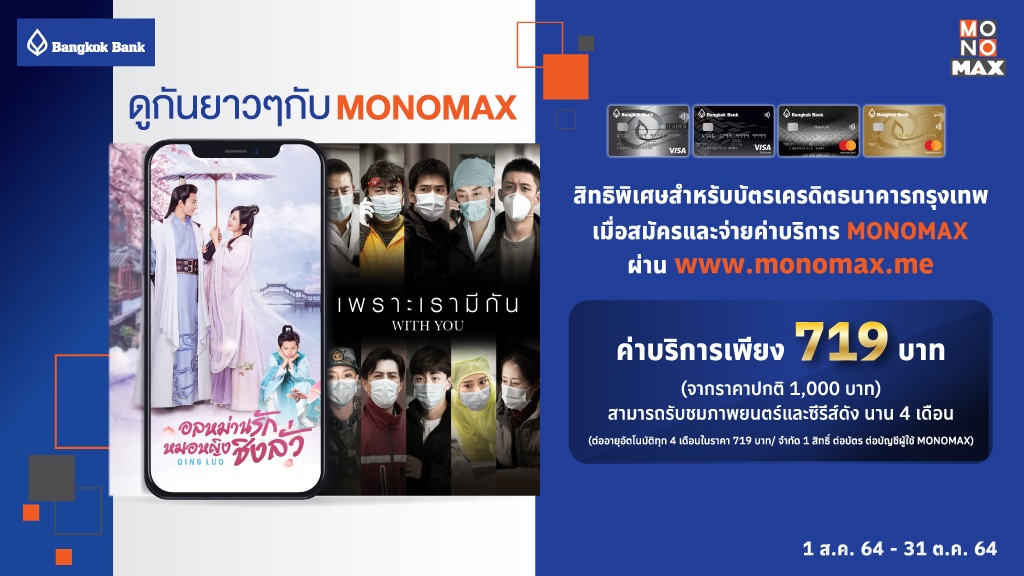 มิติหุ้น – ช่วยกันอยู่บ้าน พร้อมประหยัดให้ถึงที่สุด! “MONOMAX” (โมโนแมกซ์) ผู้ให้บริการดูหนังออนไลน์ ในเครือ Mono Next (โมโน เน็กซ์) ร่วมกับ บัตรเครดิต ธนาคารกรุงเทพ มอบสิทธิพิเศษให้กับลูกค้าบั
