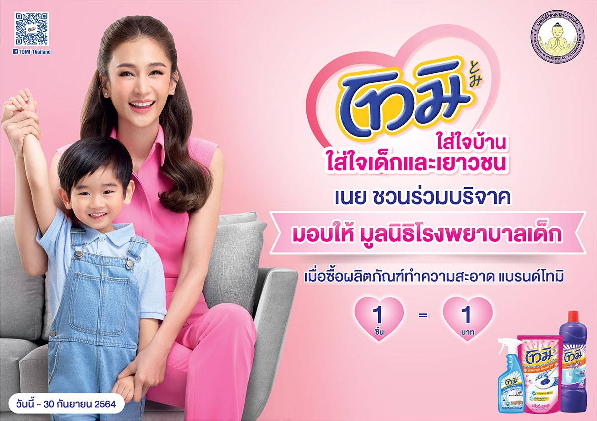 เราทุกคนสามารถร่วมเป็นส่วนหนึ่งในการมอบโอกาสให้เด็ก ๆ ได้มีชีวิตต่อ ด้วยการสมทบทุนกับมูลนิธิโรงพยาบาลเด็ก ผ่านแคมเปญ “โทมิใส่ใจบ้าน ใส่ใจเด็กและเยาวชน” ตั้งแต่วันนี้ – กันยายน 2564 เพียงสนับสนุนผลิตภัณฑ์ทำความสะอาด “โทมิ” ที่ซูเปอร์มาร์เก็ตชั้นนำ และร้านค้าทั่วประเทศใกล้บ้านหรือติดตามกิจกรรมและโปรโมชั่นดี ๆ ได้ทางเฟซบุ๊ก www.facebook.com/TomiThailand