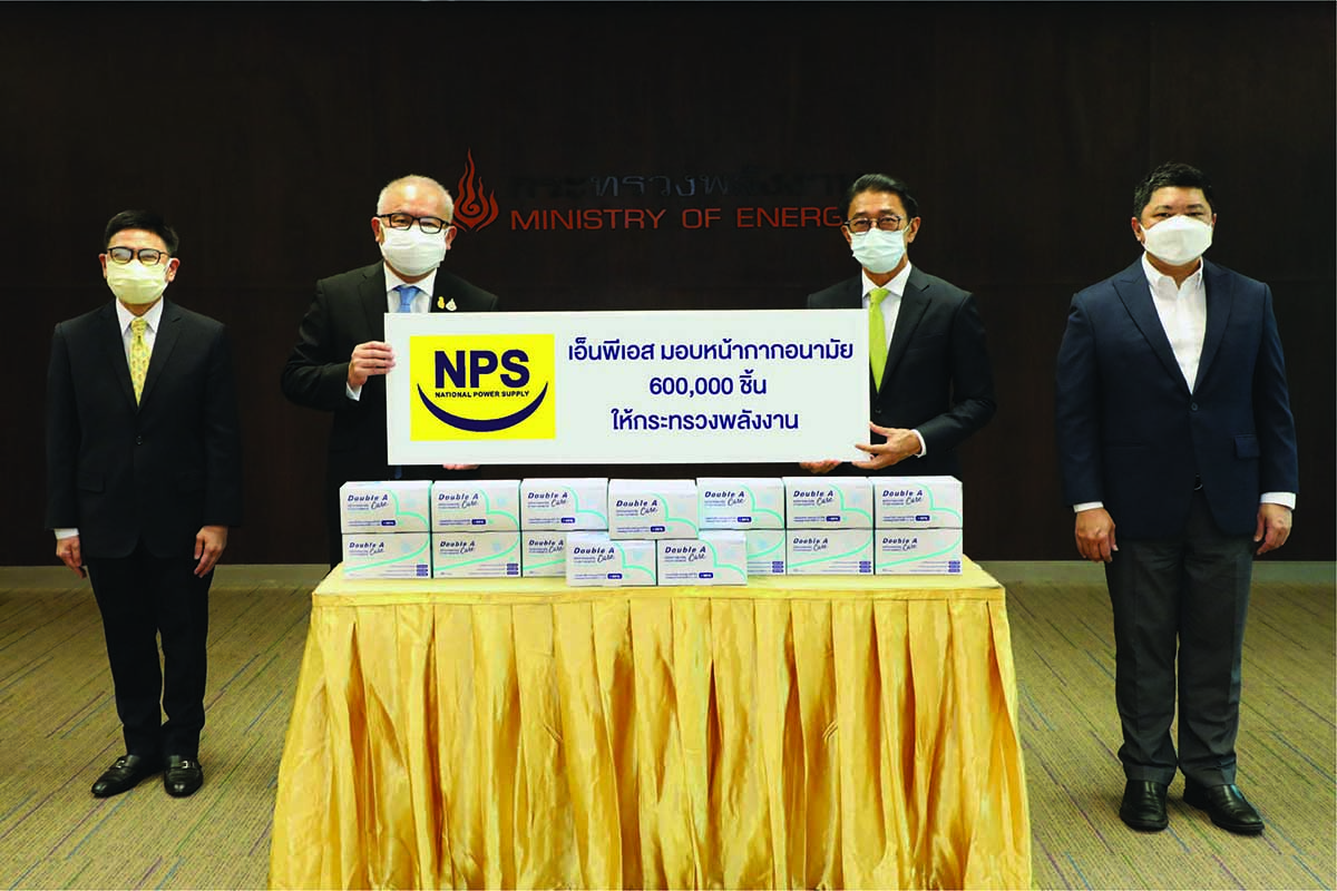 มิติหุ้น – นายโยธิน ดำเนินชาญวนิชย์ (ที่ 2 จากขวา) กรรมการผู้จัดการใหญ่ บริษัท เนชั่นแนล เพาเวอร์ ซัพพลาย จำกัด (มหาชน) หรือ เอ็นพีเอส มอบหน้ากากอนามัย จำนวน 600,000 ชิ้น ให้กับกระทรวงพลังงาน เพื่อนำไปช่วยเหลือผู้ได้รั