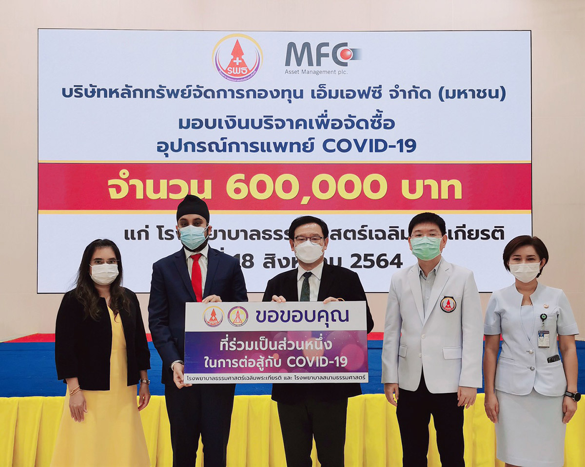 มิติหุ้น – บริษัทหลักทรัพย์จัดการกองทุน เอ็มเอฟซี จำกัด (มหาชน) หรือ MFC นำโดยคุณธนโชติ รุ่งสิทธิวัฒน์ กรรมการผู้จัดการ (ที่ 2 จากซ้าย) ร่วมด้วยคุณ ศศิวิมล สิงห์เงิน ผู้อำนวยการฝ่ายกฎหมาย และเลขานุการบริษัท (ซ้าย) เป็นผู้แทนบริษัทฯ บริจาคเงินจำนวน 600,000 บาท แก่โรงพยาบาลธรรมศาสตร์เฉลิมพระเกียรติ จังหวัดปทุมธานี โดยมีศาสตราจารย์ ดร. สุรพล นิติไกรพจน์ ประธานกรรมการบริหาร (กลาง) รองศาสตราจารย์ นายแพทย์พฤหัส ต่ออุดม ผู้อำนวยการโรงพยาบาล (ที่ 2 จากขวา) และตัวแทนคณะพยาบาลให้เกียรติเป็นผู้แทนรับมอบ เพื่อสนับสนุนการจัดหาอุปกรณ์ทางการแพทย์รองรับการขยายเตียงรักษาผู้ป่วยโควิด-19 ที่มีอาการหนัก ตามแผนการเพิ่มศักยภาพในการให้บริการของโรงพยาบาลธรรมศาสตร์เฉลิมพระเกียรติเพื่อรับมือกับสถานการณ์และความต้องการเตียงที่เพิ่มมากขึ้นจากการที่โรคโควิด-19 มีการระบาดเป็นวงกว้างทำให้มีจำนวนผู้ป่วยเพิ่มสูงขึ้นอย่างต่อเนื่อง
