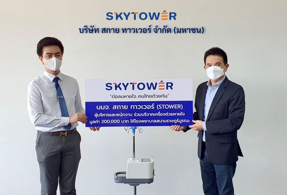 ติหุ้น – คุณธีรชัย ลีนะบรรจง ประธานเจ้าหน้าที่บริหาร บริษัท สกาย ทาวเวอร์ จำกัด (มหาชน) หรือ STOWERเป็นตัวแทนผู้บริหารและพนักงาน ร่วมบริจาคเครื่องช่วยหายใจ มูลค่า 200,000 บาทให้กับโรงพยาบาลสนามราษฎร์บูรณะ