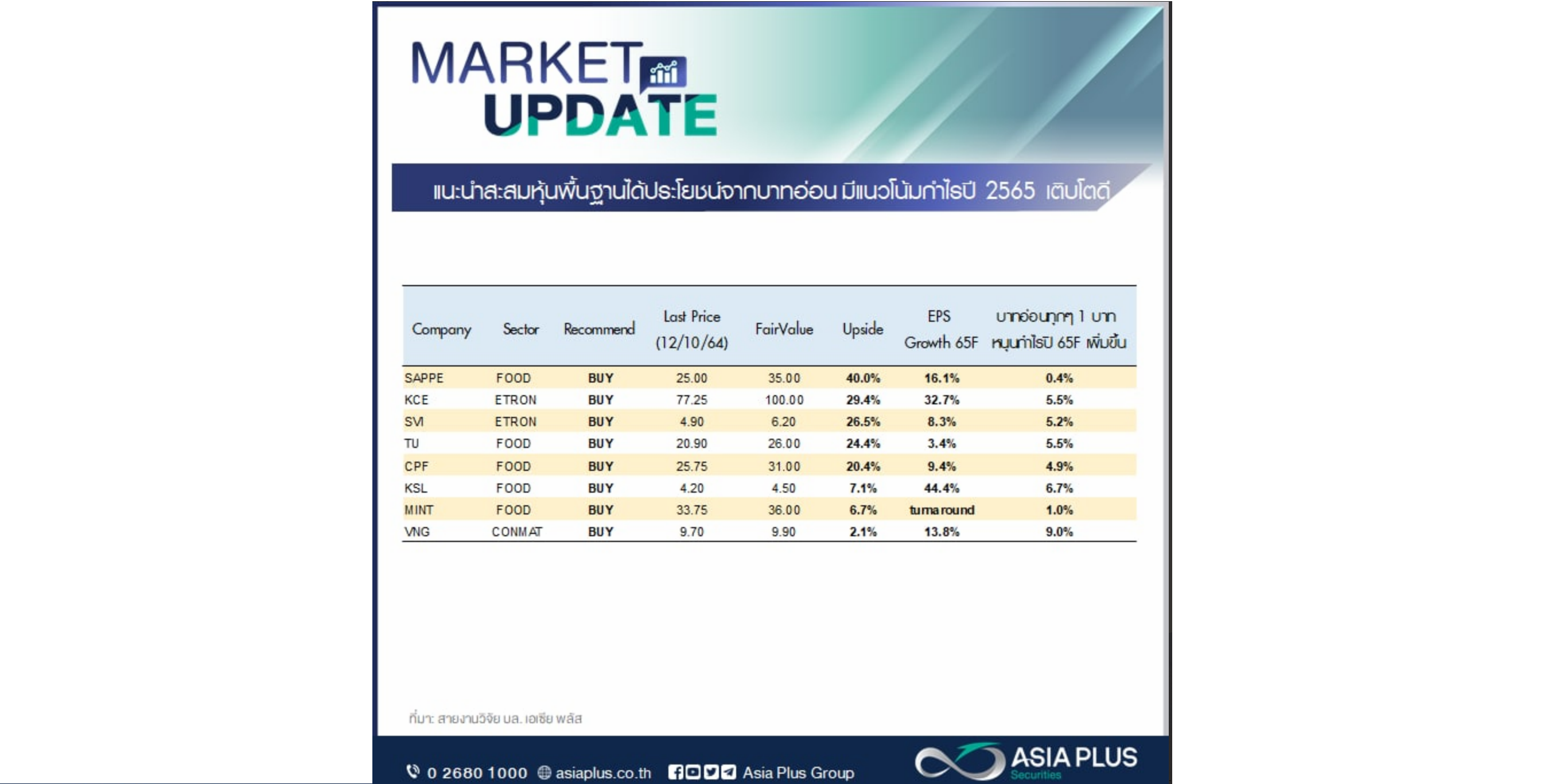 3. เป็นหุ้นที่มี Upside และฝ่ายวิจัยแนะนำ “ซื้อ”