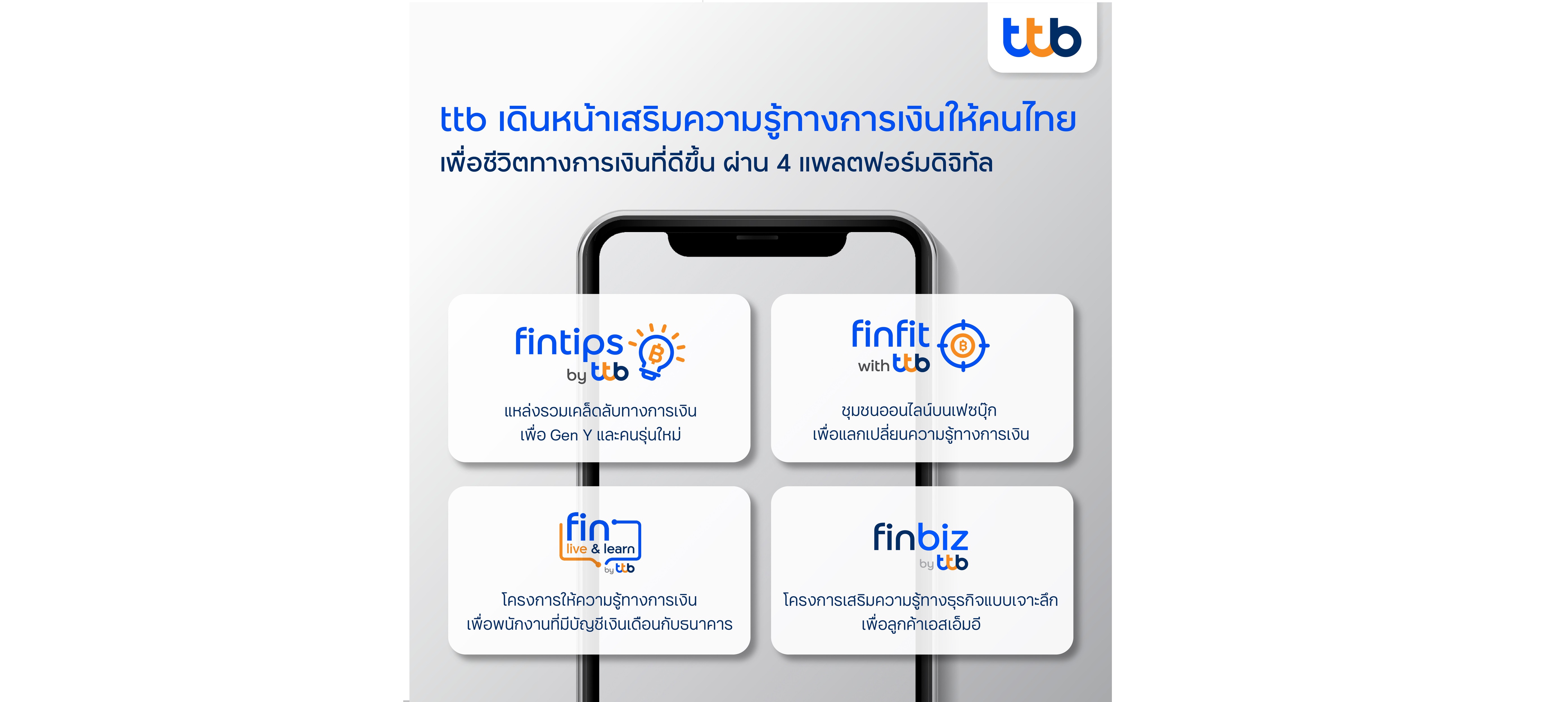 มิติหุ้น – ทีเอ็มบีธนชาต ตอกย้ำเป้าหมายการสร้างชีวิตทางการเงินที่ดีให้คนไทย เดินหน้าต่อยอดให้ความรู้ทางการเงิน ด้วยการออกแบบความรู้ที่ตอบโจทย์ตรงความต้องการของลูกค้าแต่ละกลุ่มอย่างชัดเจน ผ่าน 4 แพลตฟอร์มดิจิทัลที่เข้าถึงลูกค้าได้อย่างสะดวกคล่องตัว ได้แก่ “ฟินทิป โดย ทีทีบี”(fintips by ttb) แหล่งรวมเคล็ดลับทางการเงินสำหรับกลุ่ม Gen Y และคนรุ่นใหม่ บนเว็บไซต์ ttbbank.com และโซเชียลมีเดียต่าง ๆ ของธนาคาร, “ฟินฟิต กับ ทีทีบี” (finfit with ttb) ชุมชนออนไลน์บนเฟซบุ๊ก พื้นที่ของสมาชิกเพื่อแลกเปลี่ยนแบ่งปันความรู้เรื่องการเงิน, “ฟิน ลิฟ แอนด์ เลิร์น โดย ทีทีบี” (fin live and learn by ttb) โครงการให้ความรู้เรื่องการเงินส่วนบุคคลทางออนไลน์สำหรับกลุ่มพนักงานบริษัทต่าง ๆ ที่ใช้บริการจ่ายเงินเดือน และดูแลสวัสดิการพนักงานผ่านทีเอ็มบีธนชาต และ “ฟินบิส โดย ทีทีบี” (finbiz by ttb) โครงการเสริมความรู้ธุรกิจเพื่อลูกค้าเอสเอ็มอีบนแพลตฟอร์มดิจิทัล ทั้งเว็บไซต์ โซเชียลมีเดีย และสัมมนาออนไลน์ ที่เจาะลึกทุกบริบทของอุตสาหกรรม ยกระดับความรู้ให้ลูกค้าเอสเอ็มอี เพื่อช่วยต่อยอดธุรกิจให้เติบโตในยุคดิจิทัล