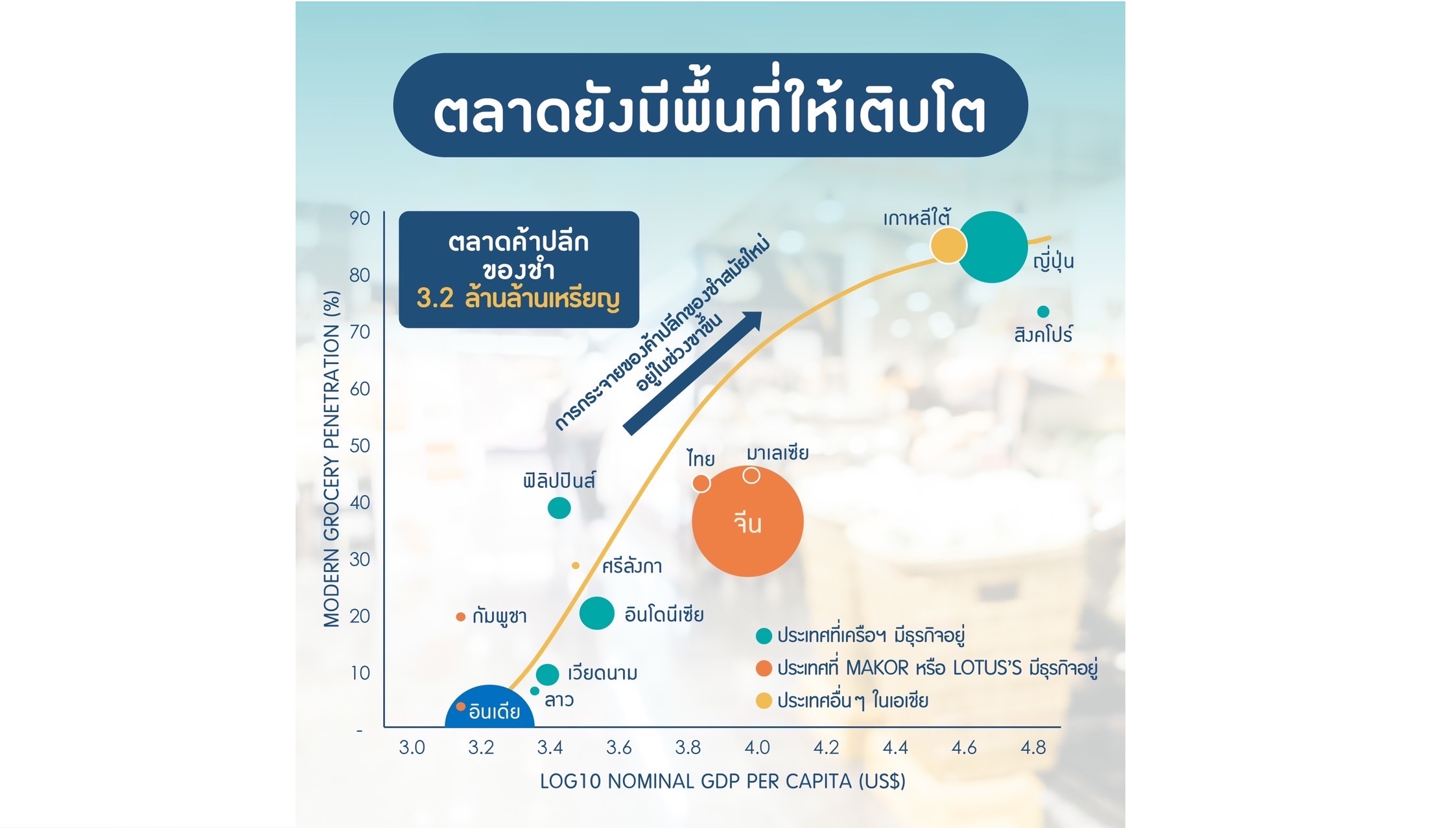 ขณะที่การเติบโตของตลาดค้าส่งค้าปลีกในระดับภูมิภาคอาเซียนยังเป็นทิศทางขาขึ้น โดยเมื่อเทียบรายได้จีดีพีต่อจำนวนประชากรในหลายประเทศในอาเซียน พบว่ายังมี “โอกาสในการเติบโต” และขยายฐานธุรกิจนี้ไปได้ทั้งในมาเลเซีย อินโดนีเซีย ฟิลิปปินส์ กัมพูชา เมียนมา เวียดนาม และ สปป.ลาว หากพิจารณาถึงภูมิทัศน์ทางธุรกิจที่แม็คโครได้รุกขยายธุรกิจในเมืองใหญ่ของประเทศเหล่านี้ และสร้างการเติบโตในช่วง 10-15 ปีข้างหน้า ก็มีโอกาสสูงมากที่ธุรกิจค้าส่งค้าปลีกและอีคอมเมิร์ซของไทยจะเป็นผู้นำเบอร์หนึ่งในประเทศต่าง ๆ เหล่านี้ แล้วเมื่อเชื่อมโยงไปยังประเทศจีนและอินเดีย ซึ่งมีประชากรรวมกันถึง 3,300 ล้านคน ก็จะเห็นถึงทิศทางที่ชัดเจนว่าวันนี้ตลาดในอาเซียนและเอเชียยังมีพื้นที่ให้เติบโตในลักษณะคล้าย S-Curve แสดงให้เห็นว่าภาพรวมตลาดโมเดิร์นเทรดของเอเชีย โดยเฉพาะของสด (Fresh) และสินค้าอุปโภคบริโภค (Grocery) ที่มีมูลค่ารวมกว่า 3.2 ล้านล้านเหรียญสหรัฐเป็นโอกาสให้บริษัทของไทยเข้าไปขยายธุรกิจและยกระดับเป็นผู้เล่นสำคัญระดับโลกได้