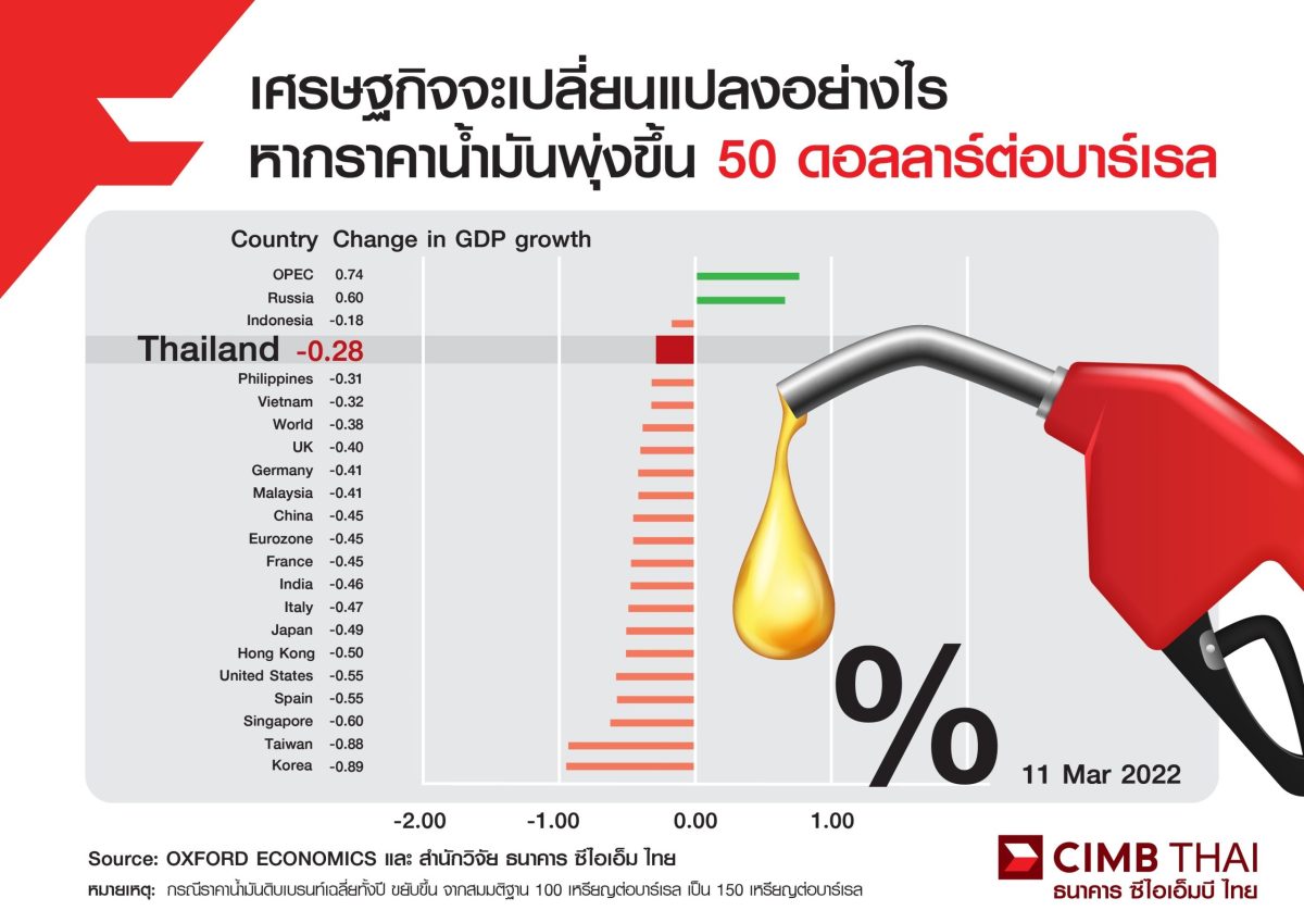 ทางสำนักวิจัยได้ใช้แบบจำลองจาก Oxford Economics (ภาพประกอบ) เปรียบเทียบผลกระทบทางเศรษฐกิจ (GDP) ในแต่ละประเทศ บนสมมติฐาน กรณีราคาน้ำมันดิบเบรนท์เฉลี่ยทั้งปี ขยับขึ้น 50 เหรียญต่อบาร์เรล จากสมมติฐาน 100 เหรียญต่อบาร์เรล ไปที่ 150 เหรียญต่อบาร์เรล จะส่งผลต่อการเปลี่ยนแปลง GDP อย่างไรเมื่อเทียบกับกรณีฐาน