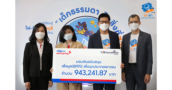 มิติหุ้น – มูลนิธิทีทีบี นำโดย ดร.เอกนิติ นิติทัณฑ์ประภาศ ประธานกรรมการ ทีเอ็มบีธนชาต หรือ ทีทีบี (ttb) (ที่ 3 จากซ้าย) พร้อมคณะผู้บริหาร รับมอบเงินสนับสนุนมูลค่า 943,241.87 บาท จากนางสาวปนัดดา ตัณฑ์ชาญชีวิน รองกรรมการผู้จัดการฝ่ายช่องทางการจัดจำหน่ายและธนบดีธนกิจ TMBAM Eastspring และ Thanachart Fund Eastspring เพื่อสนับสนุนโครงการไฟ-ฟ้า กิจกรรมสังคมเพื่อความยั่งยืนจากมูลนิธิทีทีบี เพื่อจุดประกายเยาวชนด้วยการสร้างสรรค์กิจกรรมและพัฒนาศักยภาพของตนเอง พร้อมต่อยอดสู่กิจกรรมที่เป็นประโยชน์และส่งต่อพลังแห่งการให้กลับคืนสู่สังคมอย่างยั่งยืน