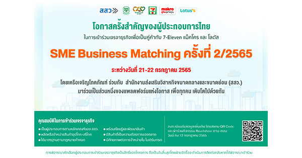 ด้าน นายวีระพงศ์ มาลัย ผู้อำนวยการสำนักงานส่งเสริมวิสาหกิจขนาดกลางและขนาดย่อม (สสว.) เปิดเผยว่า สสว. ได้ดำเนินนโยบายและมาตรการการให้ความช่วยเหลือและส่งเสริมวิสาหกิจขนาดกลางและขนาดย่อม (SME) ในประเด็นต่างๆ ที่มีความหลากหลายและครอบคลุม ตอบโจทย์ความต้องการของผู้ประกอบการเอสเอ็มอี ซึ่งปัจจุบันมีจำนวนกว่า 3,000,000 รายทั่วประเทศ รวมถึงการสร้างช่องทางในการเข้าถึงโอกาสใหม่ๆ ทางธุรกิจอย่างต่อเนื่อง เพื่อส่งเสริมการสร้างผลประกอบการและการขยายธุรกิจให้มีการเติบโตแข็งแกร่งยิ่งขึ้น โดยล่าสุดร่วมมือกับเครือซีพี ภายใต้โครงการแพลตฟอร์มแห่งโอกาส เปิดรับสมัครผู้ประกอบการ SMEs เพื่อคัดเลือกให้เข้าร่วมโครงการ Online Business Matching ครั้งที่ 2 ระหว่างวันที่ 21-22 กรกฎาคม 2565 ผ่าน Link https://bit.ly/3lA4bTj
