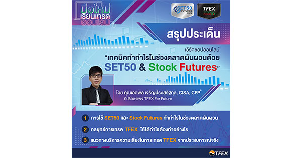 หากคุณเป็นผู้ที่อยู่ในแวดวงการลงทุนมาสักพัก คงได้ยินหรือรู้จักตลาดสัญญาซื้อขายล่วงหน้าอย่าง TFEX แน่นอน ตลาดที่เป็นทางเลือกเก็งกำไร หรือป้องกันความเสี่ยงให้พอร์ตลงทุนของคุณในยามที่ตลาดหุ้นผันผวน สามารถเทรดทำกำไรได้ทุกสภาวะตลาดทั้งขาขึ้นและขาลงโดยใช้เงินลงทุนไม่มาก เป็นตลาด Zero-Sum Game ที่ฝั่งผู้ชนะจะได้เงินจากฝั่งผู้แพ้ ทั้งหมดนี้อาจเป็นสิ่งที่คุณเข้าใจในตลาด TFEX ซึ่งจากข้อมูลสถิติของกลุ่มตัวอย่างบางส่วนพบว่า ผู้ลงทุนที่เข้ามาในตลาดนี้แล้วประสบความสำเร็จจากการเก็งกำไร มีเพียงแค่ 20% เท่านั้น ดังนั้น เพื่อให้ทุกคนได้เข้าใจการลงทุนในตราสารอนุพันธ์มากขึ้น TFEX จึงได้จัด Workshop ขึ้นมาในหัวข้อ “เทคนิคทำกำไรในช่วงตลาดผันผวนด้วย SET50 & Stock Futures” บรรยายโดย คุณเอกพล เจริยประเสริฐกุล, CISA, CFP® ที่ปรึกษาเพจ TFEX For Future …หลักการและเทคนิคทำกำไรในช่วงตลาดผันผวนจะมีอะไรบ้าง ไปดูสรุปเนื้อหาสำคัญของ Workshop ครั้งนี้กันได้เลย