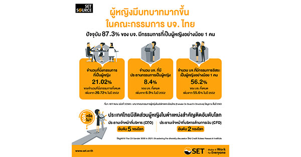 - จากการศึกษาโครงสร้างคณะกรรมการของบริษัทจดทะเบียนไทย ณ สิ้นปี 2563 จำนวน 731 บริษัท พบว่า ณ สิ้นปี 2563 สัดส่วนจำนวนผู้หญิงต่อจำนวนกรรมการทั้งชุดเพิ่มขึ้นมาอยู่ที่ 22.23% จาก ณ สิ้นปี 2562 ที่อยู่ 09% และพบว่า ณ สิ้นปี 2563 สัดส่วนจำนวนที่นั่งกรรมการเป็นผู้หญิงต่อจำนวนที่นั่งกรรมการอยู่ที่ 21.02% เพิ่มขึ้นจาก ณ สิ้นปี 2562 ที่อยู่ที่ 20.72%