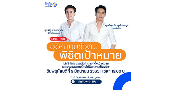 มิติหุ้น – finfit with ttb ชุมชนออนไลน์สำหรับผู้ที่ต้องการมีชีวิตทางการเงินที่ดี ขอเชิญชวนทุกคนมาร่วมค้นหาคำตอบและสร้างแรงบันดาลใจ ในกิจกรรม finfit with ttb LIVE Talk ครั้งที่ 2 ในหัวข้อ “ออกแบบชีวิต… พิชิตเป้าหมาย” ในวันพฤหัสบดีที่ 9 มิถุนายน 2565 เวลา 19.00 น. ผ่าน facebook closed