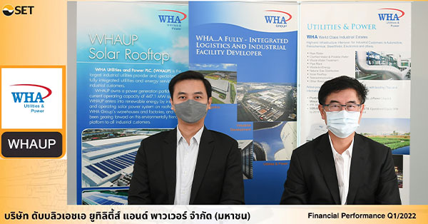 มิติหุ้น – นายสมเกียรติ เมสันธสุวรรณ (ขวา) ประธานเจ้าหน้าที่บริหาร พร้อมด้วย นายประพนธ์ ชินอุดมทรัพย์ (ซ้าย) ประธานเจ้าหน้าที่ฝ่ายบริหารการเงิน บมจ.ดับบลิวเอชเอ ยูทิลิตี้ แอนด์ พาวเวอร์ (“WHAUP”) นำเสนอข้อมูลบริษัทฯ ภายในงานบริษัทจดทะเบียนพบนักลงทุน (Opportunity Day) ณ อาคาร WHA Tower ภายหลังประกาศผลการดำเนินงานงวดไตรมาส 1 ปี 2565 มีรายได้และส่วนแบ่งกำไรจากการดำเนินงานปกติ 608 ล้านบาท และมีกำไรจากการดำเนินงานปกติ 69 ล้านบาท ประกาศเดินหน้าขยายธุรกิจน้ำ-ไฟฟ้ารวมถึงพอร์ตธุรกิจพลังงานสะอาดต่อเนื่อง พร้อมตั้งเป้ายอดเซ็นสัญญาซื้อขายไฟฟ้าโครงการพลังงานแสงอาทิตย์ในปี 2565 แตะ 150 MW