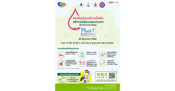 มิติหุ้น – ศูนย์การค้าเอ็ม บี เค เซ็นเตอร์ ร่วมกับ สภากาชาดไทย เชิญชวนร่วมบริจาคโลหิต บริจาคอวัยวะและดวงตา กู้วิกฤตการขาดแคลน ในกิจกรรม Plus 1 เพิ่มจำนวนครั้ง เพิ่มโลหิต เพิ่มชีวิต ในวันพฤหัสบดีที่ 30 มิถุนายน 2565 ตั้งแต่เวลา 11.00 น. – 15.00 น. บริเวณชั้น 6 โซน B พร้อมรับของที่ระลึก Limited Edition หน้ากากผ้า และ สเปรย์แอลกอฮอล์
